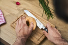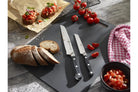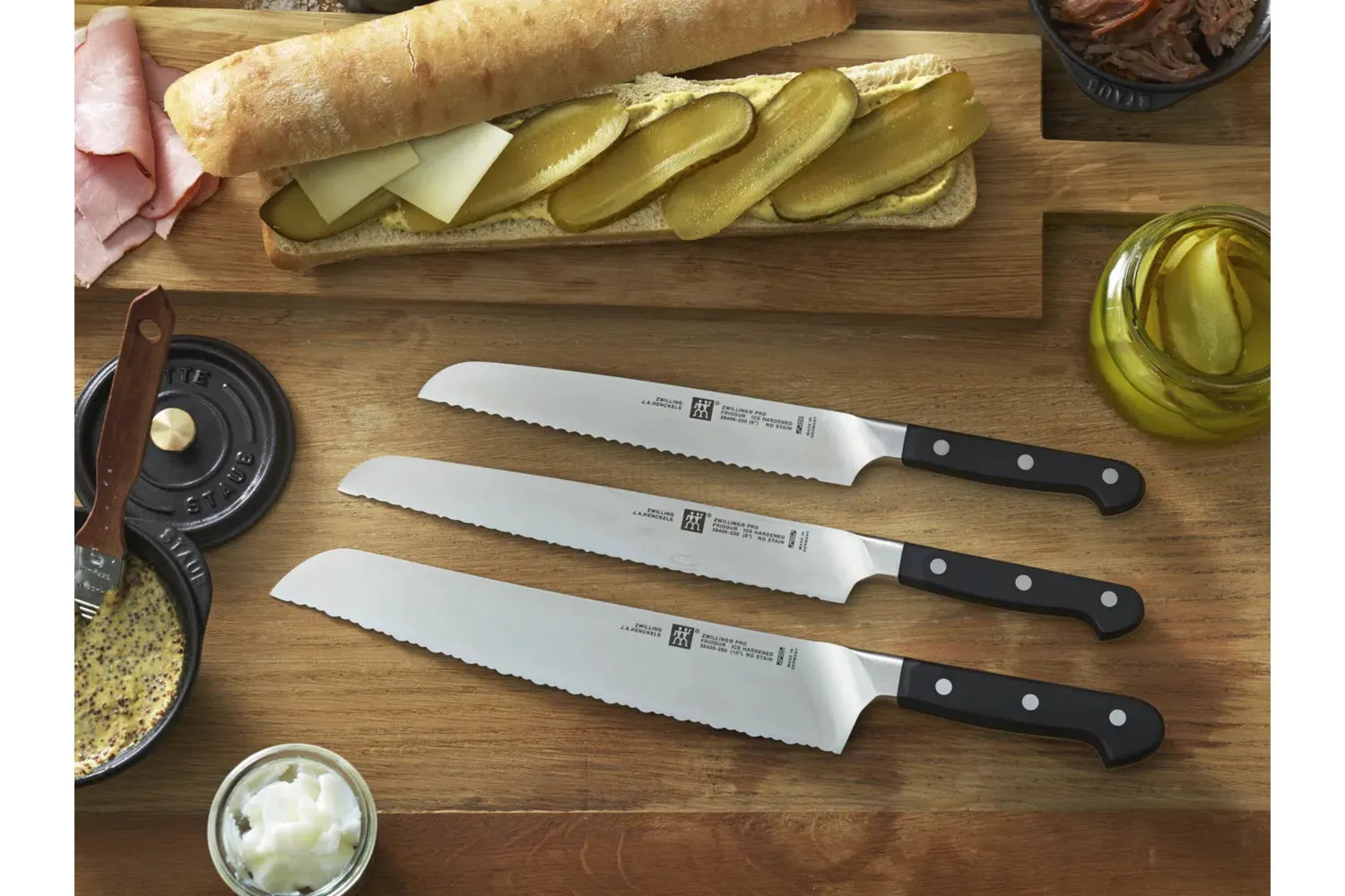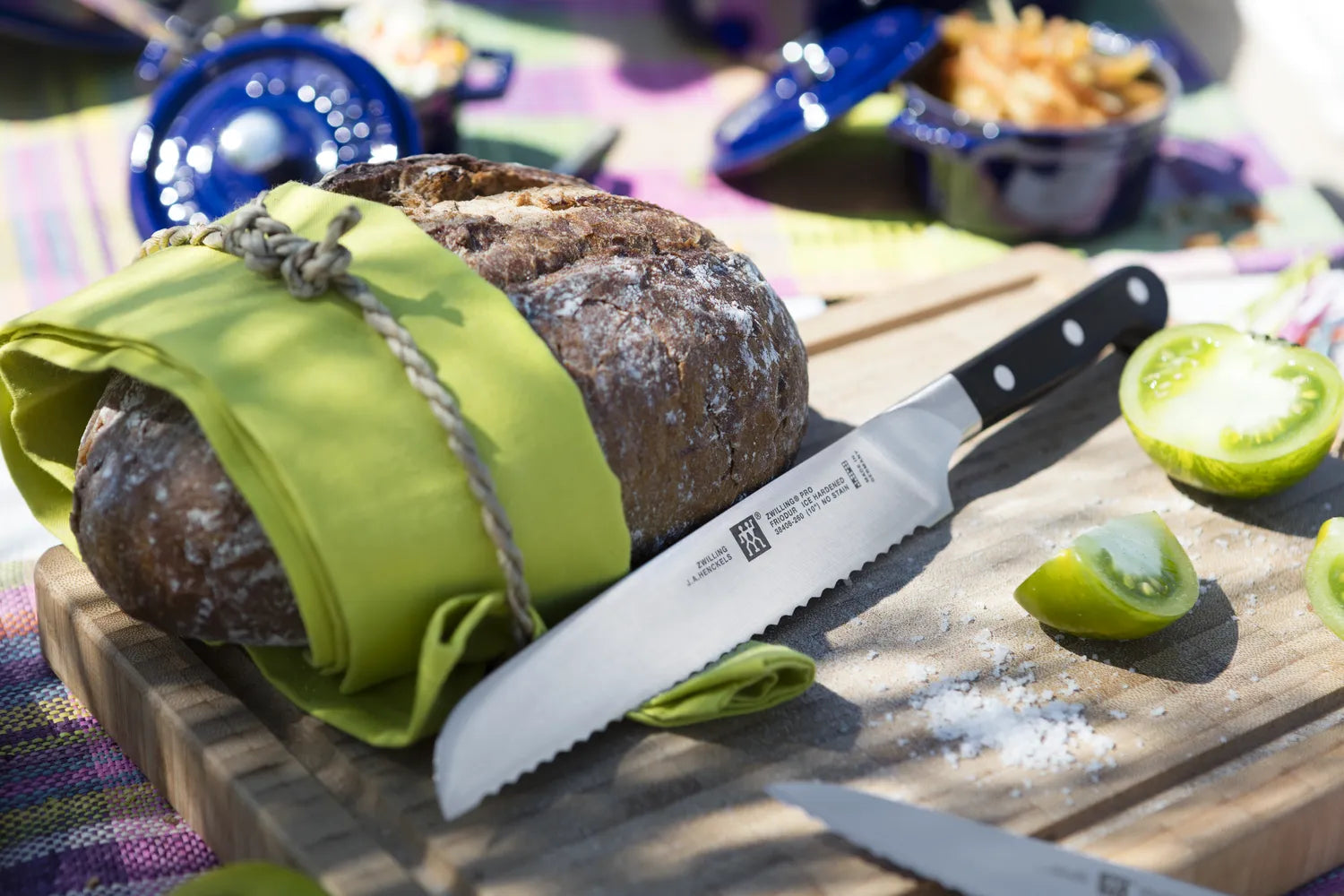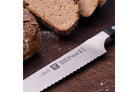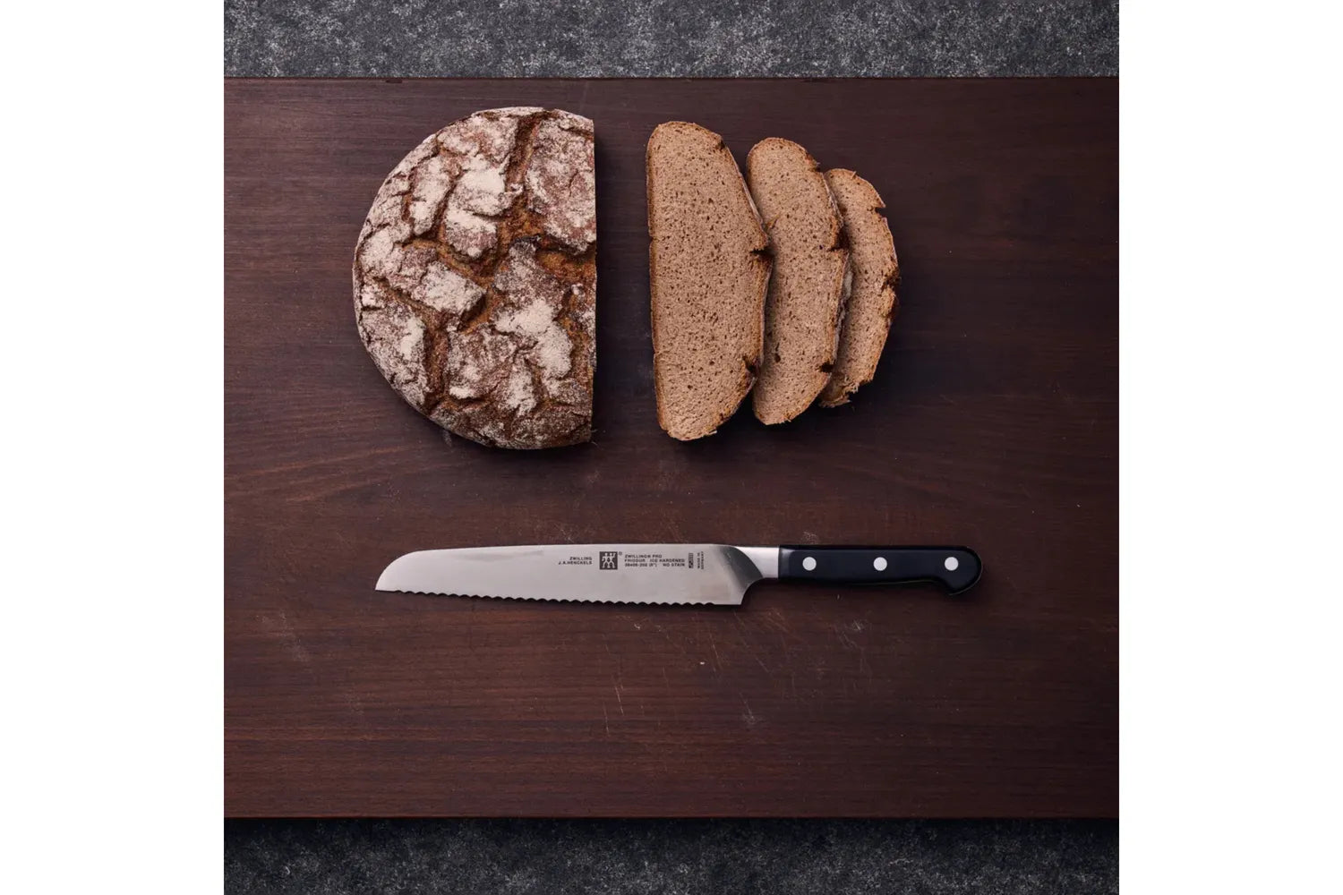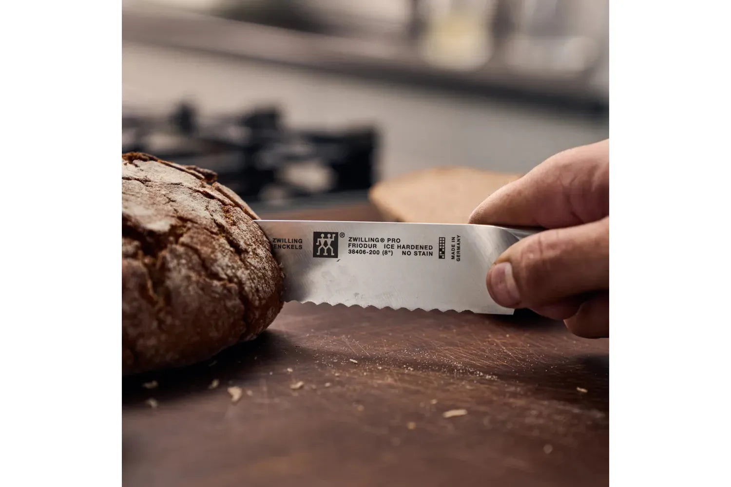 Denna högkvalitativa brödkniv från ZWILLING Pro-serien imponerar med sin unika form som möjliggör säker, exakt skärning och elegant design av den kända italienska designern Matteo Thun. Den 20 cm brödkniven har ett långt blad med en skarp räfflad kant som skivar genom hårda brödskorpor utan problem som gör att du kan skära snygga, enhetliga brödskivor. Den avfasade kanten som sträcker sig till bultarna gör att du enkelt kan klippa stora bröd. Knivens kilform, en symbios av japansk och europeisk knivdesign, garanterar stabilitet vid skärning. Det långa FRIODUR®-bladet är tillverkat av högkvalitativt ZWILLING specialbehandlat rostfritt stål, som avslutas med speciell ishärdning. Kniven är precisionssmidd av ett enda stålstycke för perfekt balans, vilket underlättar skäregenskaperna. ABS-plasthandtagen ger ökad säkerhet vid skärning. Tre nitar på handtaget kompletterar den eleganta designen av kniven. Med denna praktiska ZWILLING-brödkniv kommer du att kunna förbereda välsmakande smörgåsar på nolltid och skära perfekta brödskivor till frukosten.