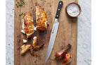Kött/filékniven är perfekt när du behöver skära ingredienserna i tunna skivor. En professionell helsmidd kniv för alla matintresserade. Skiva mat med precision med sitt 26 cm långa tunna blad. Som namnet på denna kniv antyder är den först och främst utformad för att skära kött, särskilt för att förbättra filea av rökt eller lufttorkad skinka. Men det kan också användas för många andra uppgifter i köket, till exempel om du behöver filea fisk eller skiva kött. Den enastående kvaliteten på detta redskap gör att du nu enkelt kan utföra allt arbete i köket. Det speciella formelstålet ZWILLING producerar enastående egenskaper, ytterligare förbättrat av ishärdningen som bladet genomgår för att producera ett stål med enastående skärkanthållning och korrosionsbeständighet. Det precisionssmidda bladet ger exakt skärverkan, så att du enkelt kan skära all mat med denna kniv. Det ergonomiska handtaget och den böjda bolsterformen säkerställer att kniven är enastående bekväm att hålla, vilket förbättrar dess säkerhet och komfort. Använd köttkniven från ZWILLING Pro-serien för att skära skinka och kött med lätthet.