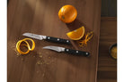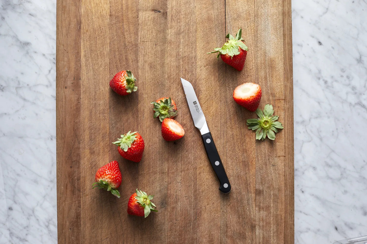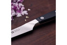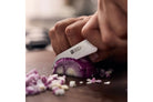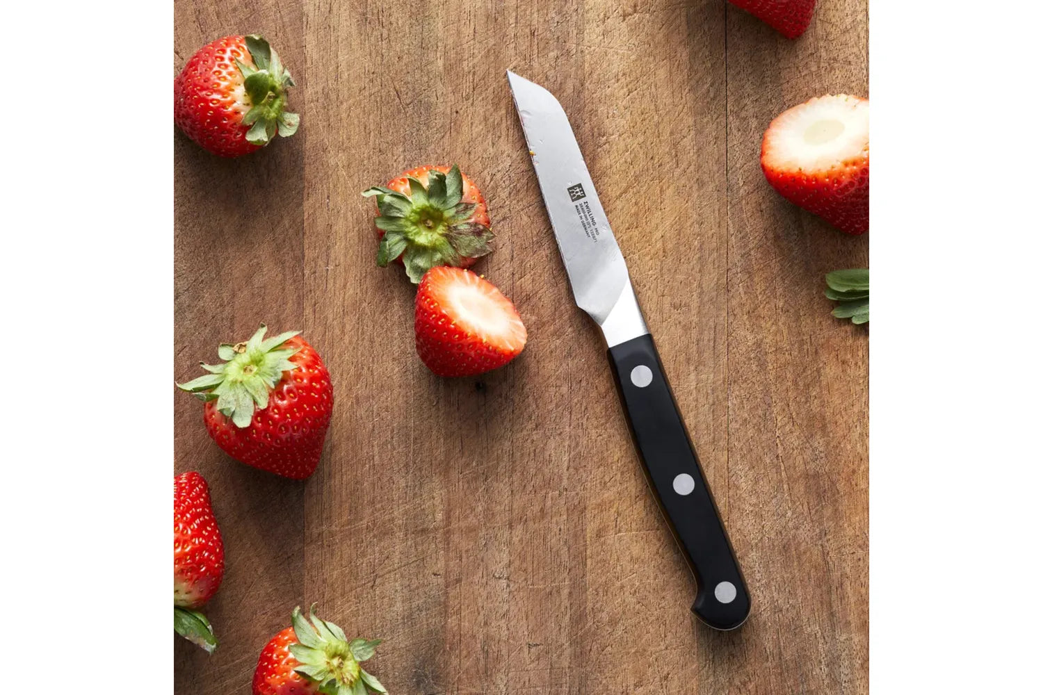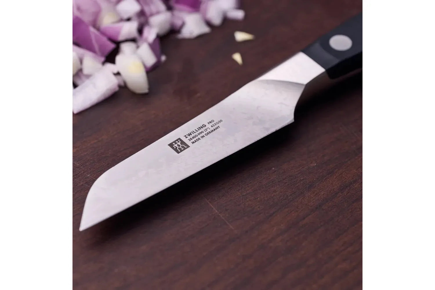 Vegetabilisk kniv från ZWILLING® Pro-sortimentet är ett utmärkt val för skalning, skärning eller garnering av grönsaker. Med en bladlängd på 9 cm och en rak, kontinuerlig skärkant är den idealisk för skärtekniker som vanligtvis används vid tillagning av grönsaker. Skiva tomater eller skär morötter i tunna Julienne-remsor utan problem med denna kniv. Det skarpa bladet uppnår ett rent snitt även på mjuka grönsaker. Hårdare sorter kan hackas enkelt. Du kan också skära grönsaker i dekorativa garneringar, som gurkafläktar, rädisablommor eller tomatkorgar. Kniven sticker ut på grund av sin precision, stabilitet och korrosionsbeständighet på grund av användningen av ZWILLING specialformelstål. Knivarna är precisionssmidda av ett enda stålstycke och ishärdade för att garantera långvarig skärpa. Den böjda övergången från blad till handtag är sömlös och kniven är bekväm att hålla. Handtaget av halkfri, styv plast är fäst vid den kontinuerliga tang med tre nitar. ZWILLING grönsakskniv hjälper dig att förbereda läckra grönsaksrätter, sallader och garneringar snabbt och med liten ansträngning.