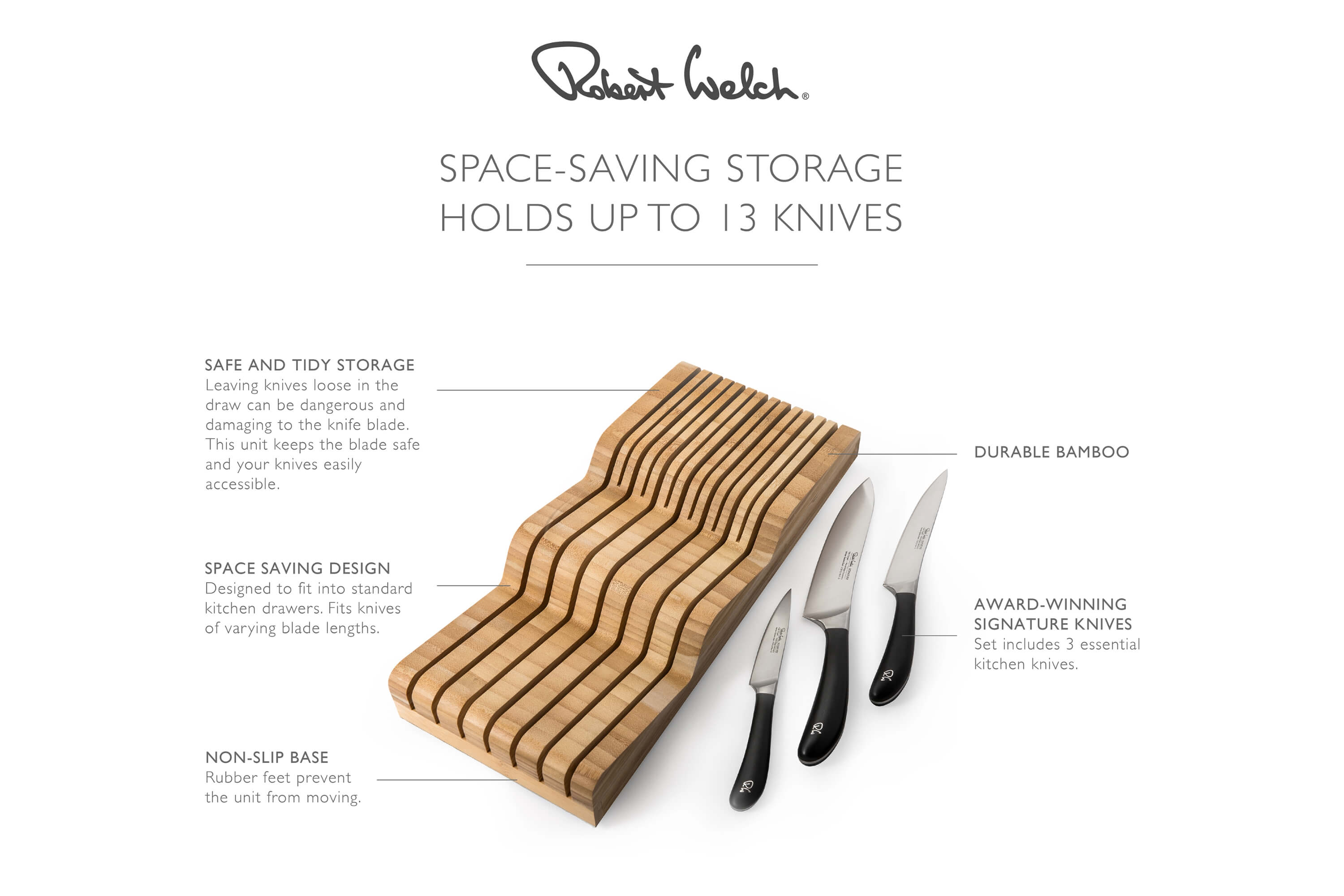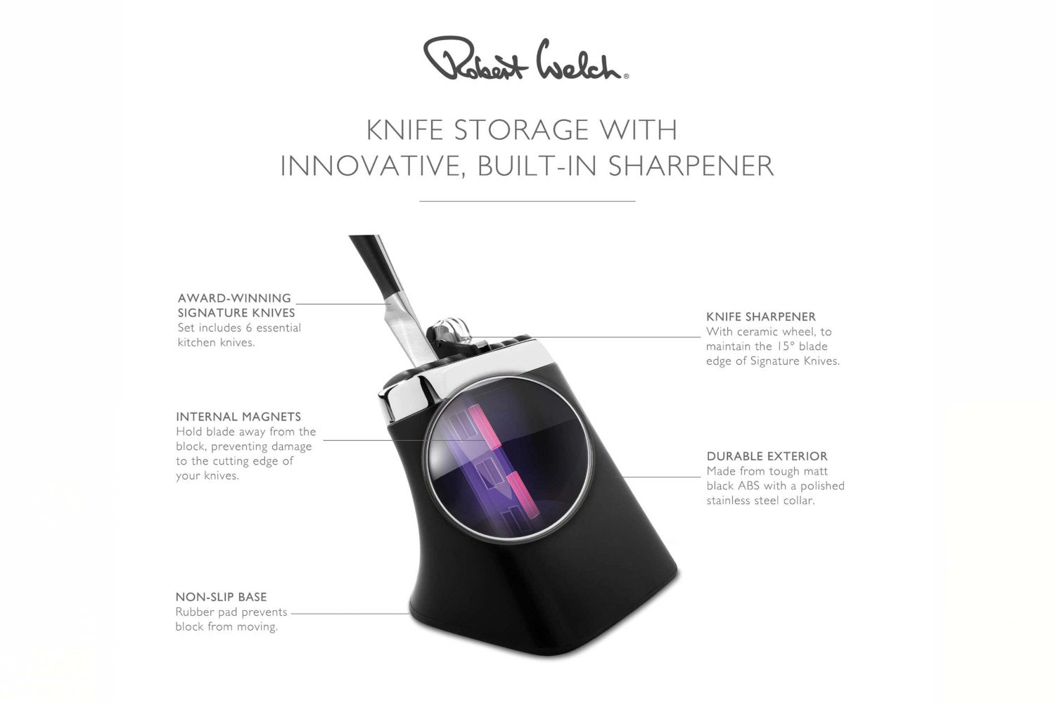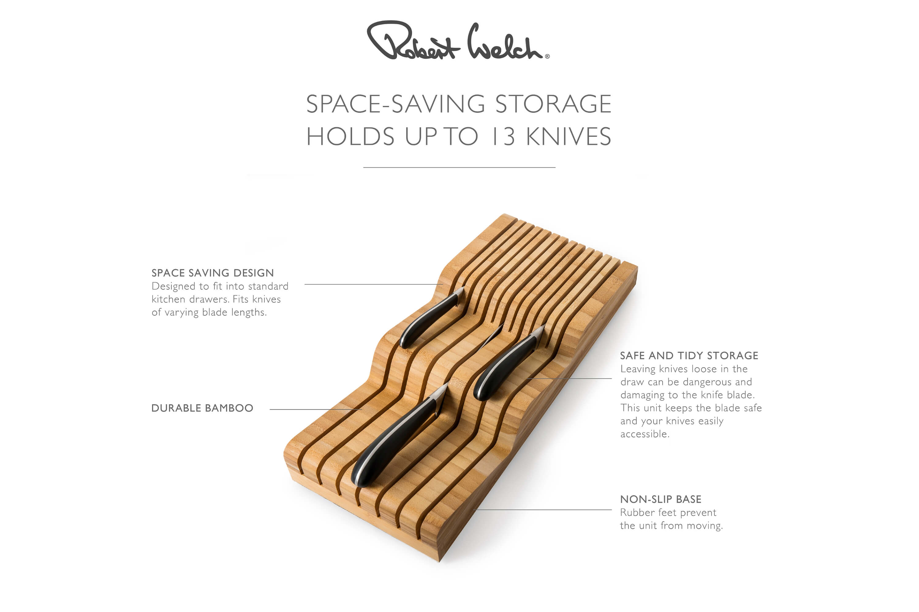 - Skyddar knivarnas egg – Förhindrar att knivarna blir slöa genom kontakt med andra föremål.
