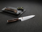 Den 16 cm långa gyuton har ett slätt och avsmalnande knivblad, vilket gör att kniven passar bra för att skära och strimla fisk och kött. Större grönsaker är heller inget problem. Miyabi har satsat på en autentisk japansk bladprofil, vilket ger kniven en extrem hårdhet och skärpa. Skäregenskaperna avrundas med det bekväma handtaget av pakkaträ. Knivbladet tillverkas av pulverstål av mikrokarbid som bäddas in i två andra stållager. Genom en speciell process härdas knivbladet ytterligare, t.ex. genom ishärdning vid -196 °C, för att uppnå extrem hårdhet och skärpa. Knivbladet är slipat på båda sidorna och har slutligen slipats med Honbazuke-tekniken. Tsuchime-looken med den hamrade ytan är dessutom snygg. Det ergonomiskt formade handtaget är tillverkat av -pakkaträ. Det är ett mörkt trä med mjuk ådring som utgör en snygg kontrast till knivbladet. Handtaget är böjt som en svanhals, vilket möjliggör enkelt skärarbete. Handtaget ger en bra balans, precis som med alla knivar i serien MIYABI 6000MCT. Tack vare balansen kan du arbeta länge utan att tröttas ut. Med den högklassiga, japanska kniven kan du utföra många olika arbeten i köket.