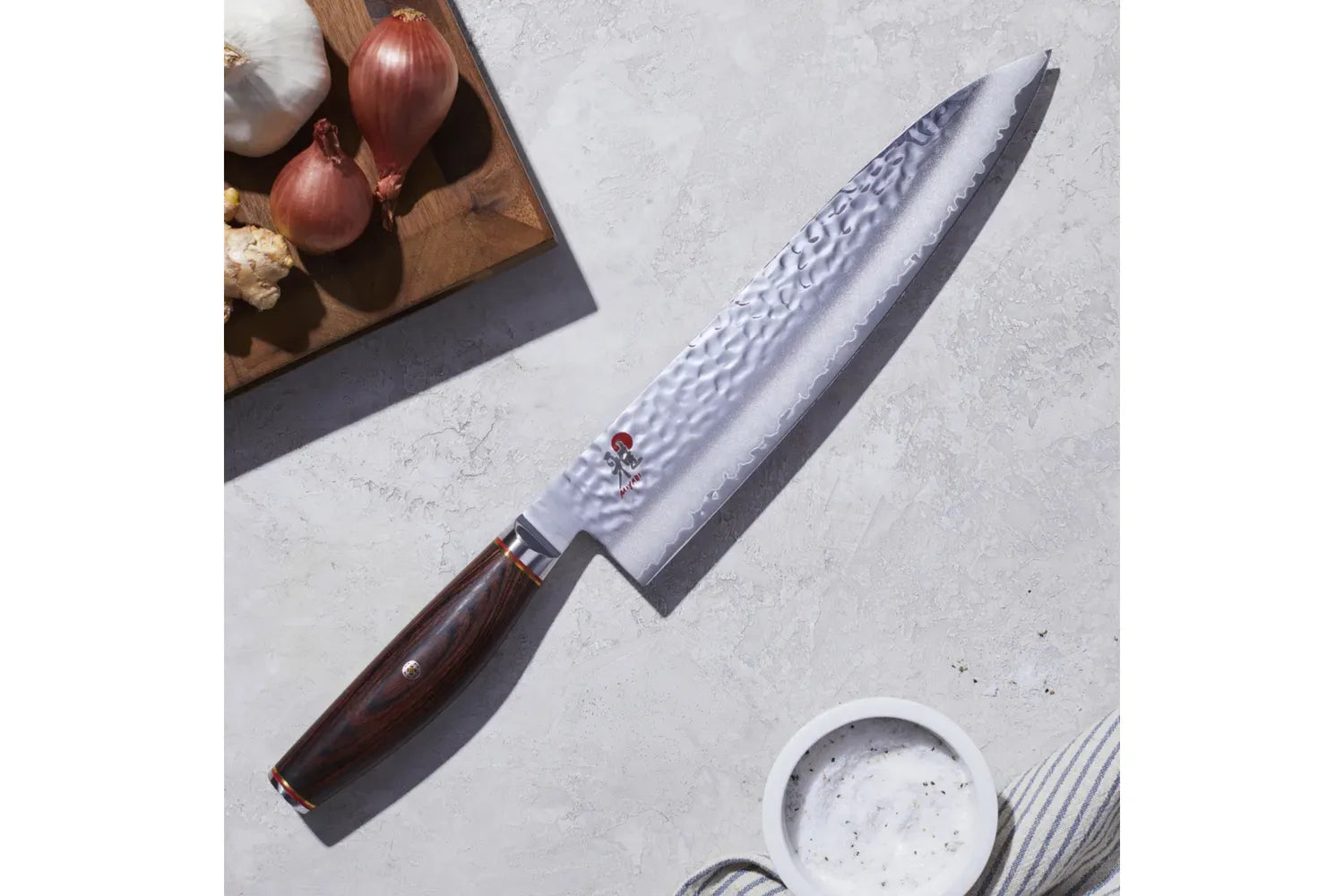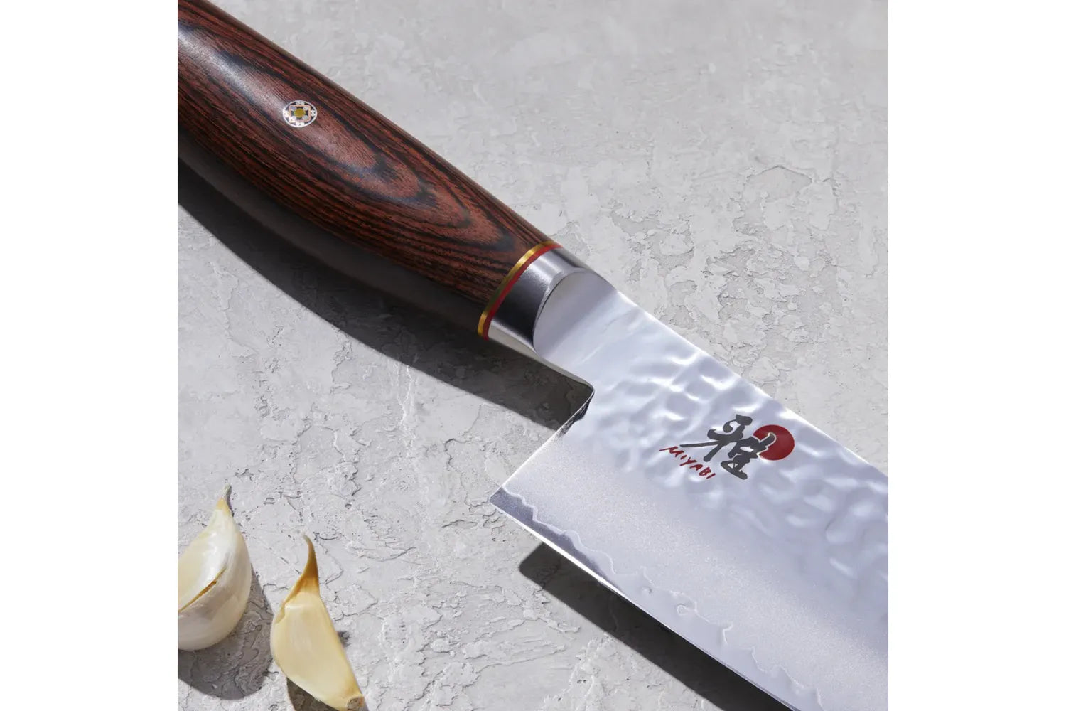 Den 24 cm långa gyuton från MIYABI 6000MCT-serien från Miyabi är fantastisk när det gäller att skära kött och fisk i exakta bitar. Den avsmalnande formen gör den lämpad för att lirka ut ben, fiskben med mera samtidigt som trähandtaget ligger perfekt i handen. Den autentiska, japanska knivbladsprofilen bidrar också till knivens skärpebeständighet. Det släta avslutet av knivbladet sörjer för extra säkerhet genom att förhindra att man glider av handtaget. Handtaget är tillverkat av Pakka-trä och har en specialutvecklad form som är svagt böjd. Den ergonomiska formen gör att du kan göra betydande framsteg när du hackar och skär. Dessutom är balansen i själva handtaget noggrant avvägd för att reducera kraftansträngningen vid användning. Det viktigaste är dock gyutons knivblad, som är tillverkat av mikro-karbid pulverstål. Detta stål är extremt hårt, cirka 63 Rockwell, och är inbäddat i ytterligare två stålskikt. Tsuchime-utseendet uppnås med hammarslagmetoden. Behandling med olika härdningsprocesser som ishärdning gör också kniven mer korrosionsbeständig och flexibel. Den avrundas slutligen med en dubbelsidig slipning. Med gyuto från Miyabi kan du arbeta snabbt och säkert i ditt kök.