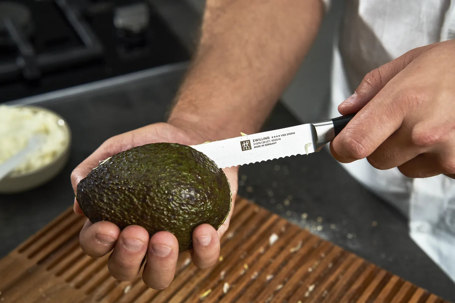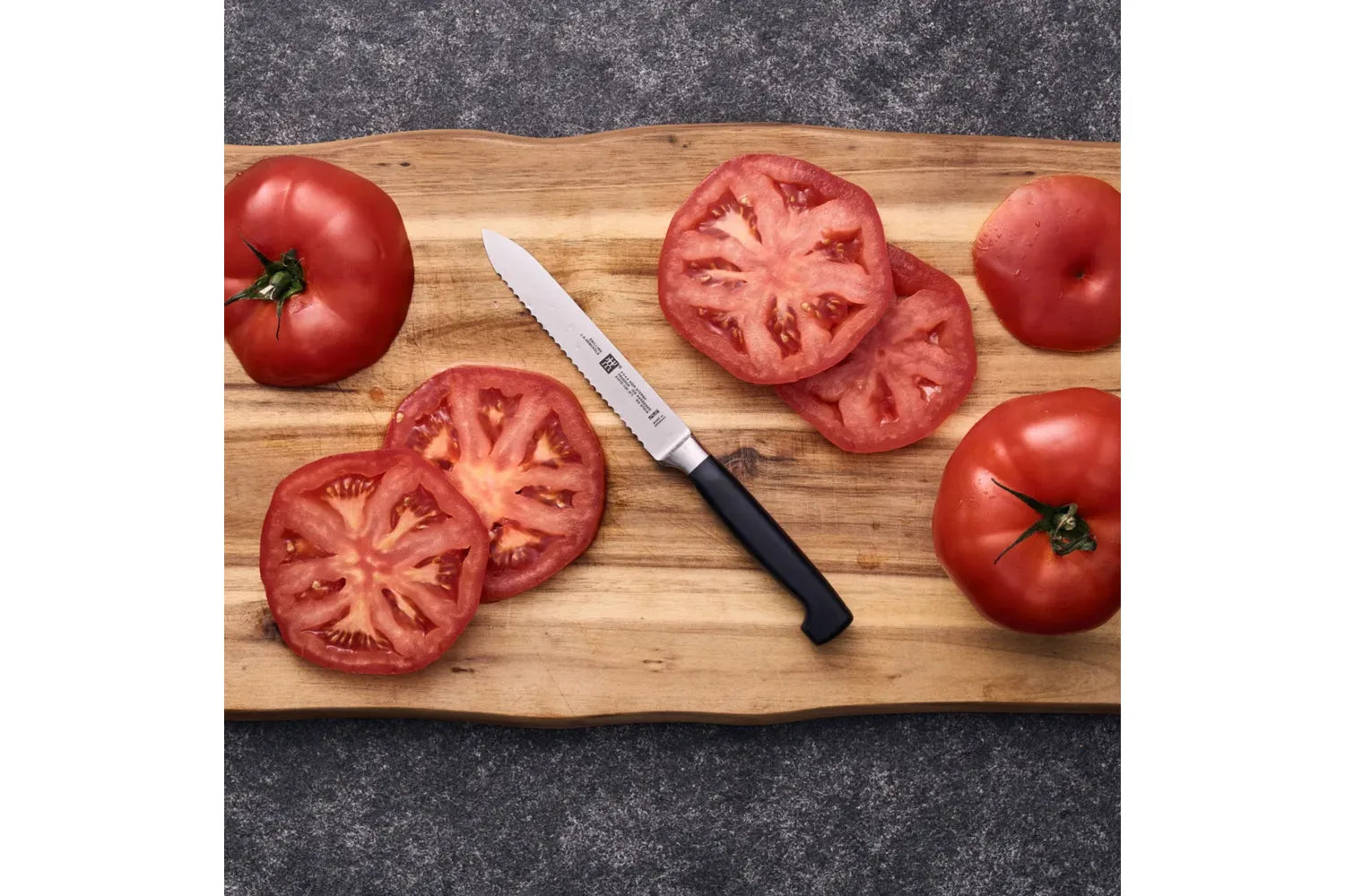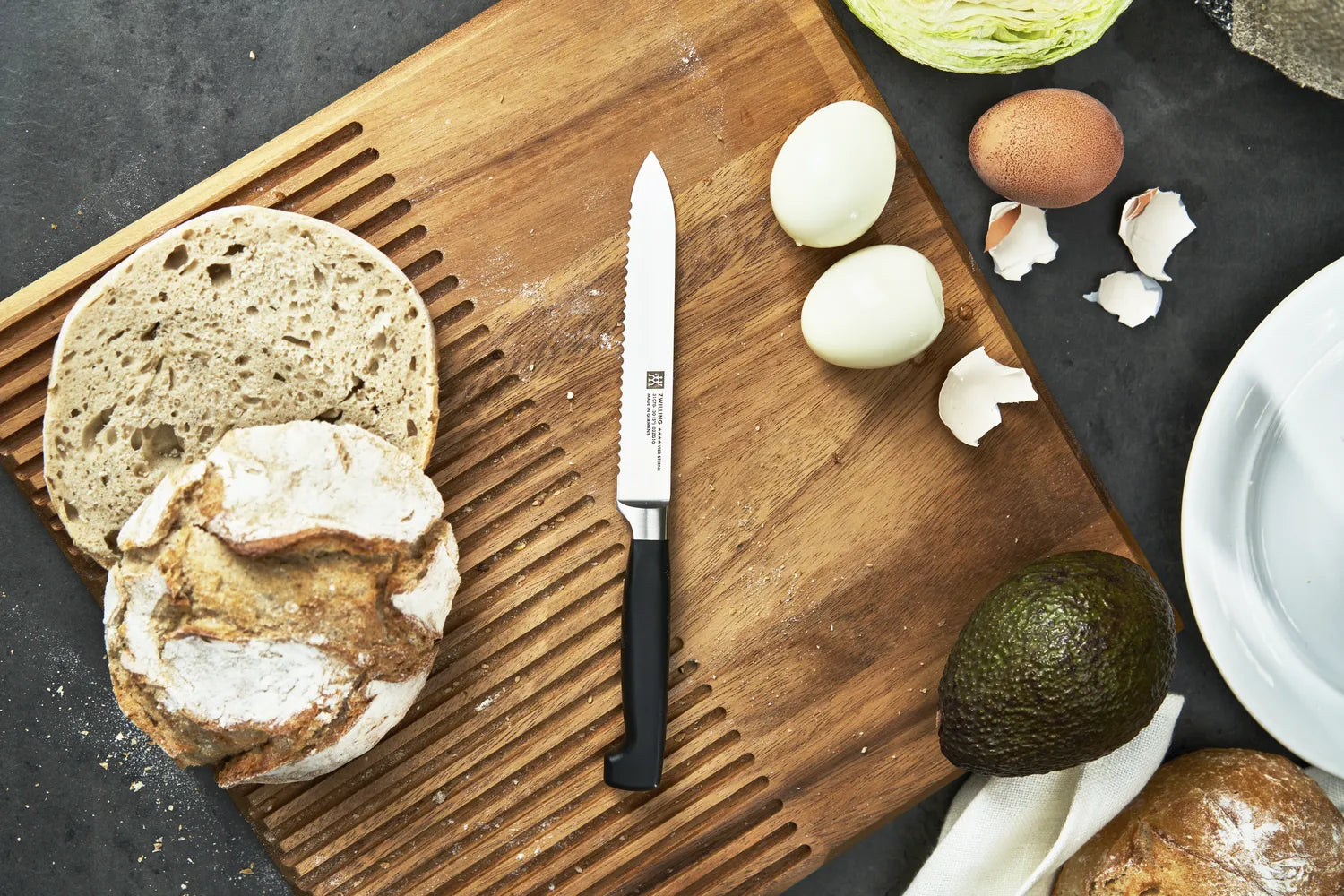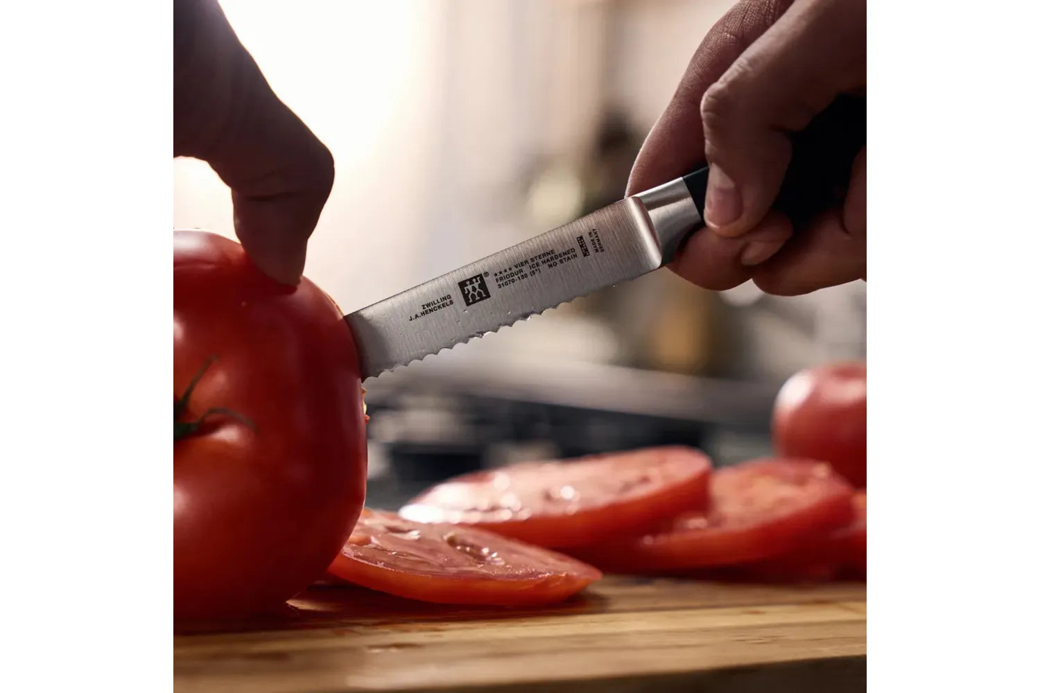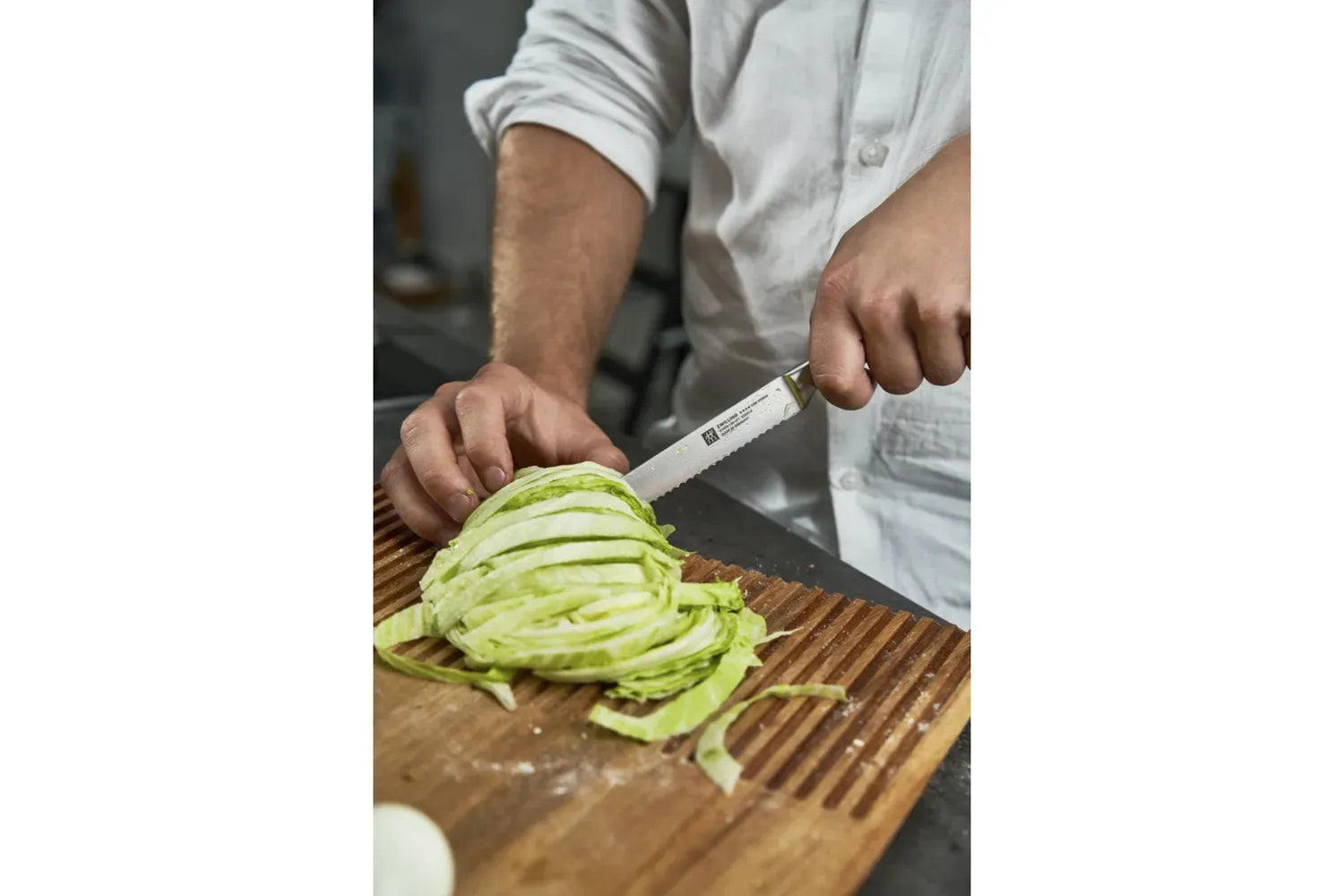 Funktionskniven från FOUR STAR®-serien utmärker sig genom sin beprövade, klassiska design såväl som genom ergonomi och en hög grad av komfort när du klipper med den. Denna medelstora kniv med ett 13 cm blad kan användas på många olika sätt. Hjälpknivens kantade kant gör den till en allroundare i ditt kök. Den kan enkelt skära korv, ost eller tomatskivor och är särskilt lämpad för tillagning av snacks och kalla måltider. Det stål som används för bladet är rostfritt och gör verktygskniven lätt att rengöra, mycket fjädrande och hållbar. FRIODUR®-bladet förädlades också genom en speciell ishärdningsprocedur, som säkerställer att bladet är extremt vass, motståndskraftigt mot korrosion och flexibel. Den sömlösa övergången från bolster till handtag gör det lättare att hantera kniven. SIGMAFORGE®-kniven är smidd av ett stålstycke som garanterar de bästa geometri- och skäregenskaperna. Den perfekta balansen säkerställs av hållaren som också fungerar som en fingeravskärmning för att minimera risken för att din hand glider av handtaget i bladet. Verktygskniven från ZWILLING är en högkvalitativ multitalent i ditt kök tack vare dess användningsområde och säkra grepp.