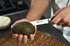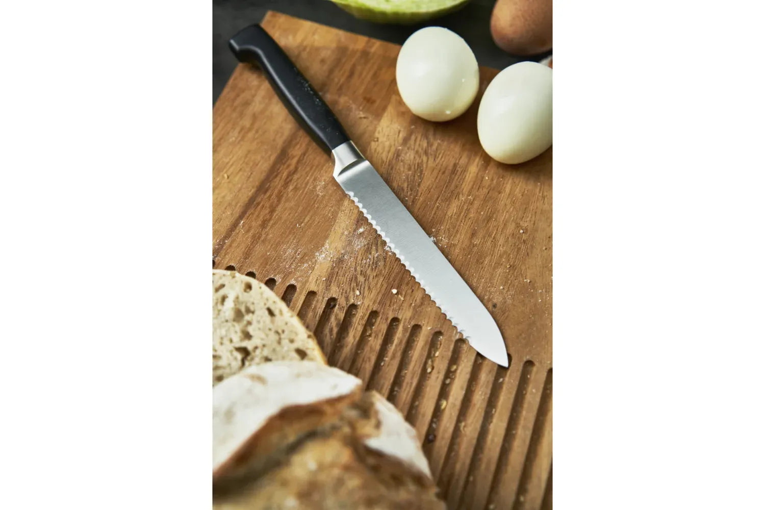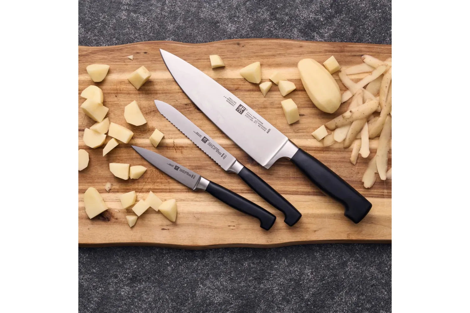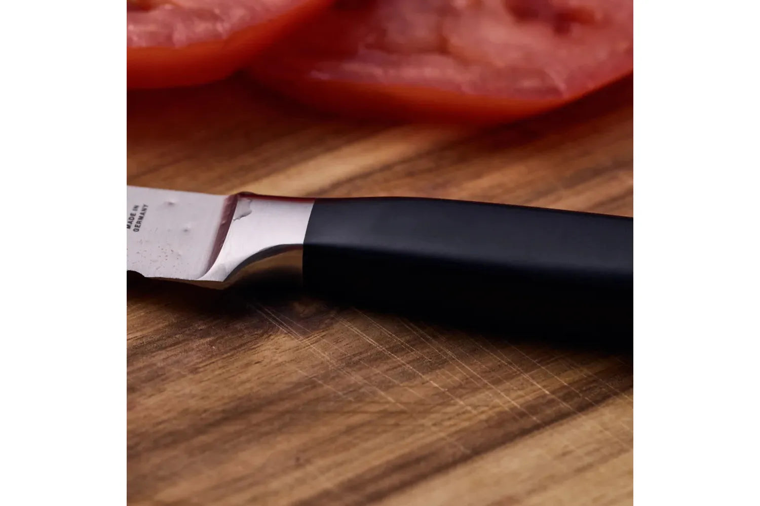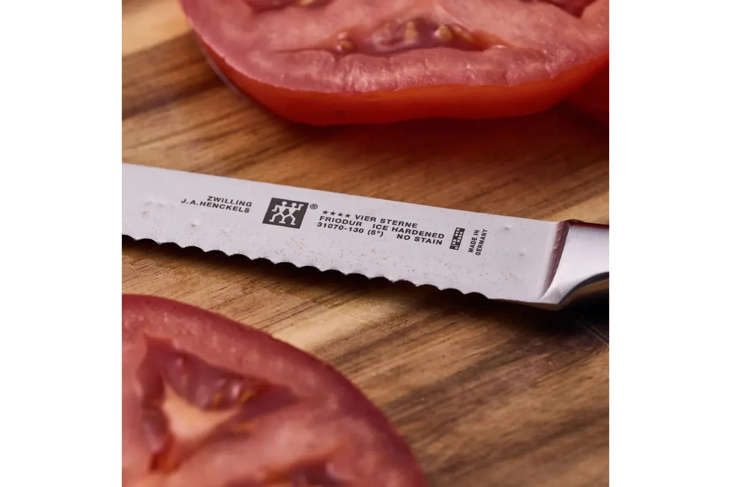 Funktionskniven från FOUR STAR®-serien utmärker sig genom sin beprövade, klassiska design såväl som genom ergonomi och en hög grad av komfort när du klipper med den. Denna medelstora kniv med ett 13 cm blad kan användas på många olika sätt. Hjälpknivens kantade kant gör den till en allroundare i ditt kök. Den kan enkelt skära korv, ost eller tomatskivor och är särskilt lämpad för tillagning av snacks och kalla måltider. Det stål som används för bladet är rostfritt och gör verktygskniven lätt att rengöra, mycket fjädrande och hållbar. FRIODUR®-bladet förädlades också genom en speciell ishärdningsprocedur, som säkerställer att bladet är extremt vass, motståndskraftigt mot korrosion och flexibel. Den sömlösa övergången från bolster till handtag gör det lättare att hantera kniven. SIGMAFORGE®-kniven är smidd av ett stålstycke som garanterar de bästa geometri- och skäregenskaperna. Den perfekta balansen säkerställs av hållaren som också fungerar som en fingeravskärmning för att minimera risken för att din hand glider av handtaget i bladet. Verktygskniven från ZWILLING är en högkvalitativ multitalent i ditt kök tack vare dess användningsområde och säkra grepp.