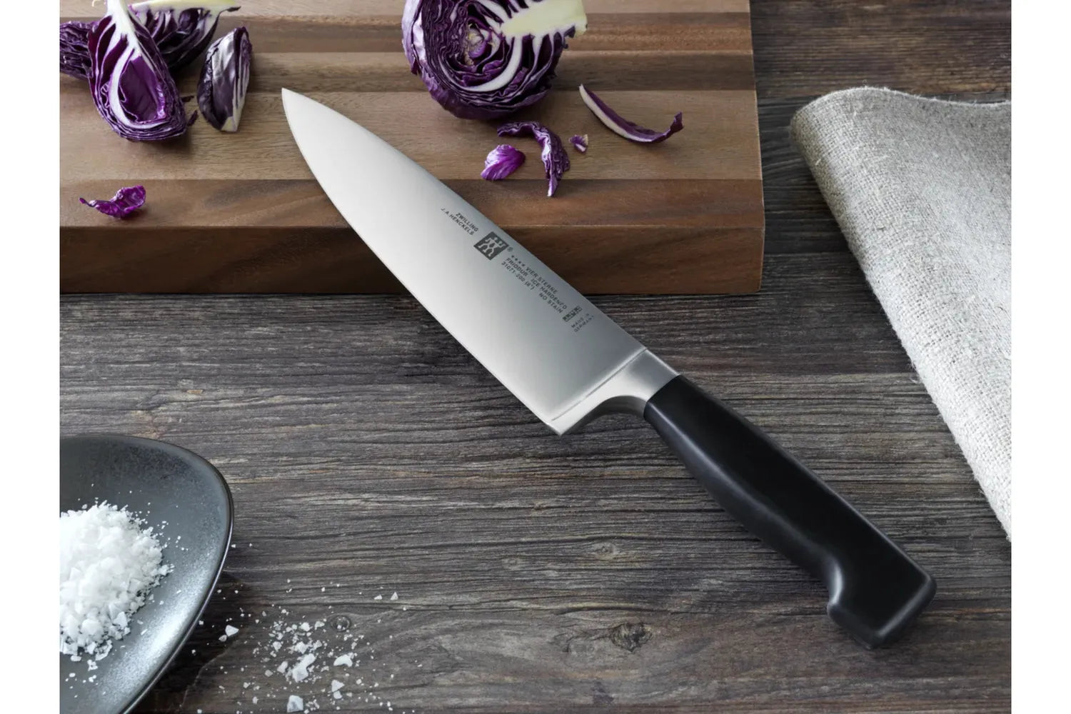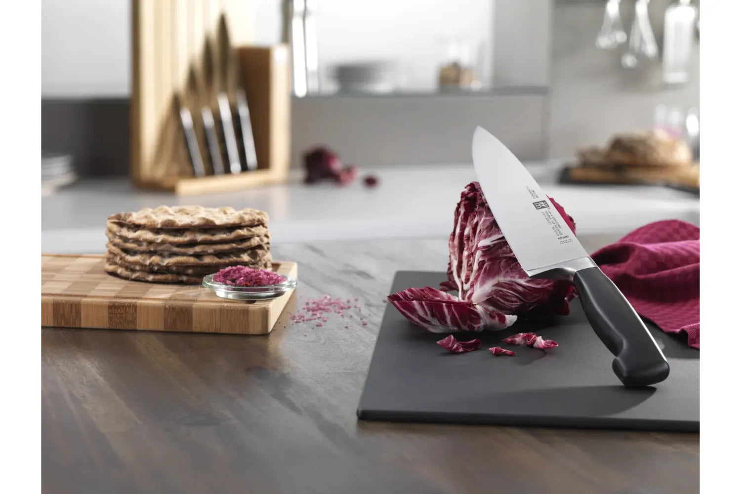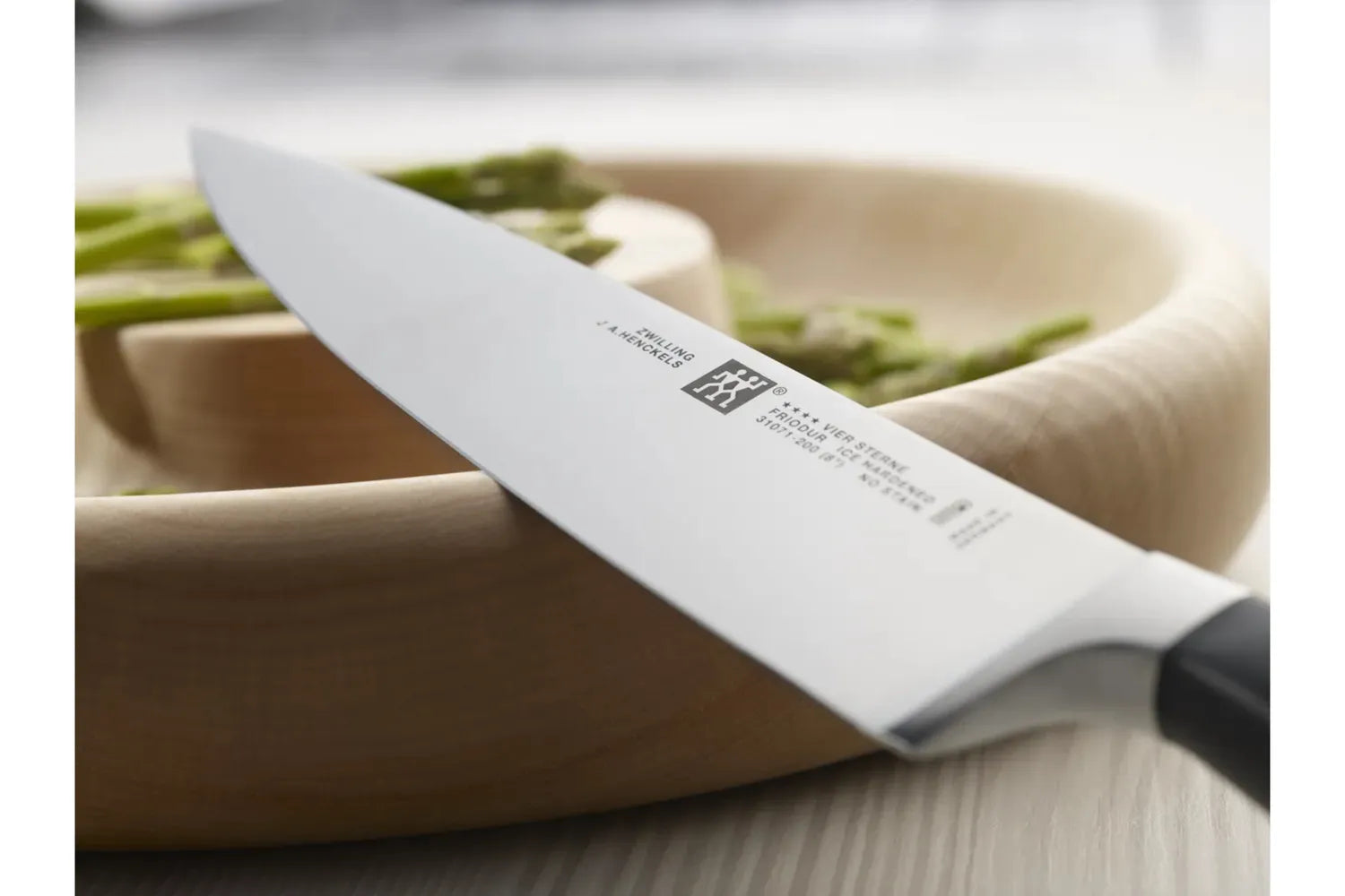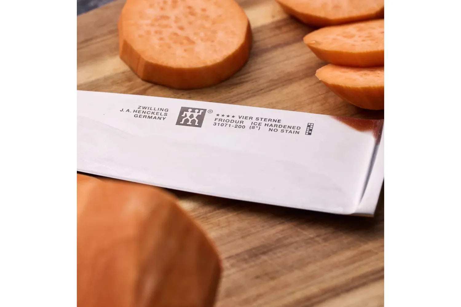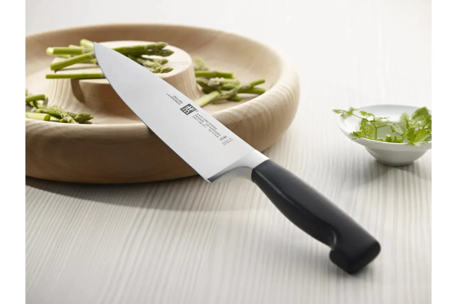 Kockens kniv från FOUR STAR®-serien är ett verktyg för en mängd köksuppgifter. Det är idealiskt för tillagning av fisk, kött, fjäderfä eller vegetariska recept och kommer att skära utan problem genom alla ingredienser. Det 20 cm bladet gör det speciellt lämpat för att tillverka ingredienser i större storlekar, som att fin skära upp stora köttbitar eller hugga upp större grönsaker. Ett special utvecklat stål som är rostfritt och robust ger kniven sina enastående egenskaper. En ishärdad yta förbättrar materialet ytterligare för att möjliggöra en precisionskant för skärpa. Det är då lätt att skära upp ingredienser med kockens kniv från ZWILLING. Handtaget är ergonomiskt utformat för att sitta bekvämt i handen och göra även svåra uppgifter lätta. En kantlös övergång från handtag till bolster förbättrar också användningen.