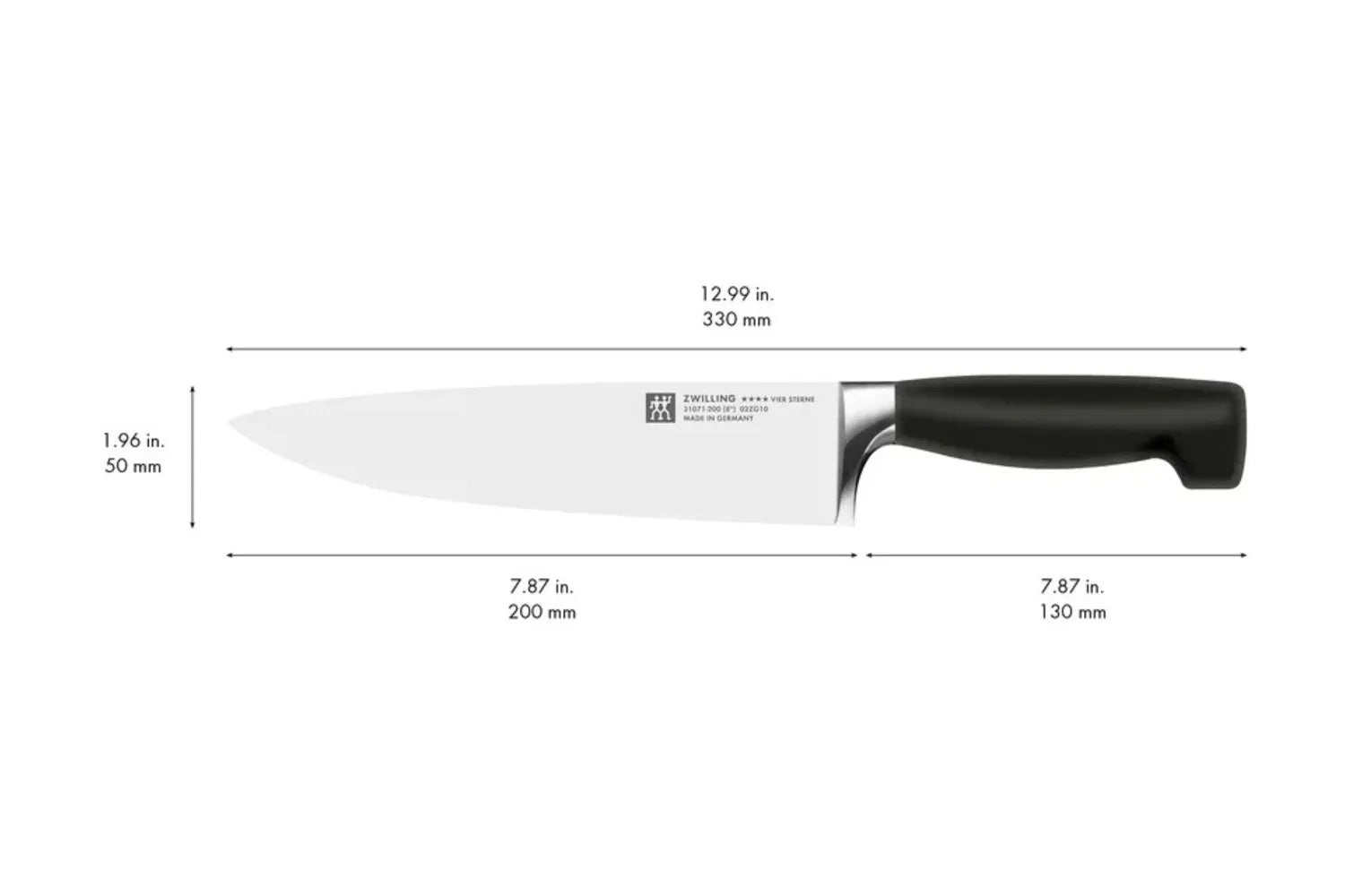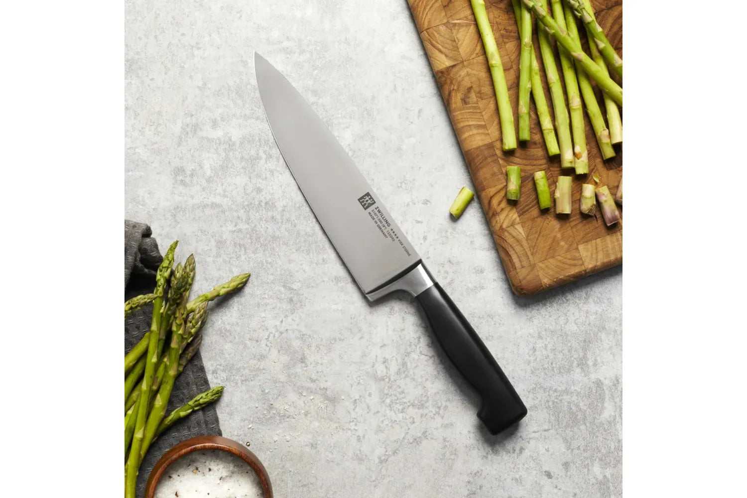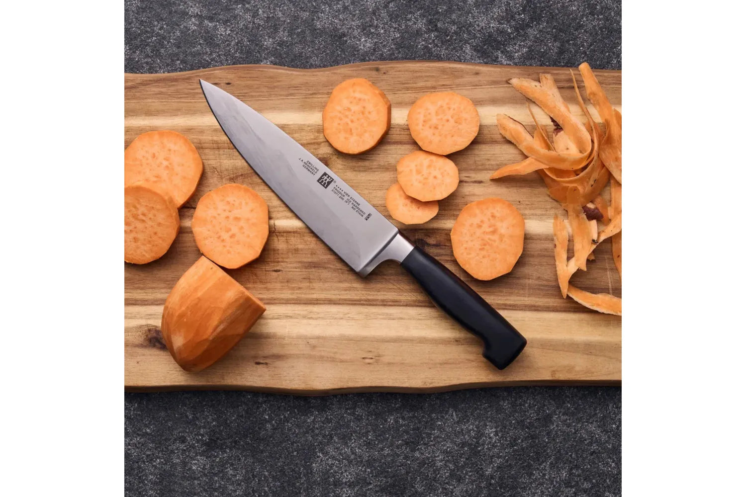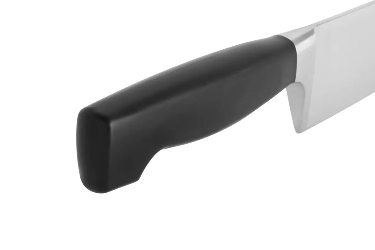Kockens kniv från FOUR STAR®-serien är ett verktyg för en mängd köksuppgifter. Det är idealiskt för tillagning av fisk, kött, fjäderfä eller vegetariska recept och kommer att skära utan problem genom alla ingredienser. Det 20 cm bladet gör det speciellt lämpat för att tillverka ingredienser i större storlekar, som att fin skära upp stora köttbitar eller hugga upp större grönsaker. Ett special utvecklat stål som är rostfritt och robust ger kniven sina enastående egenskaper. En ishärdad yta förbättrar materialet ytterligare för att möjliggöra en precisionskant för skärpa. Det är då lätt att skära upp ingredienser med kockens kniv från ZWILLING. Handtaget är ergonomiskt utformat för att sitta bekvämt i handen och göra även svåra uppgifter lätta. En kantlös övergång från handtag till bolster förbättrar också användningen.