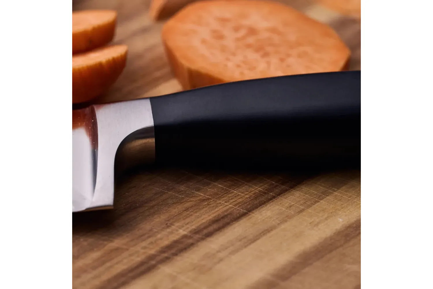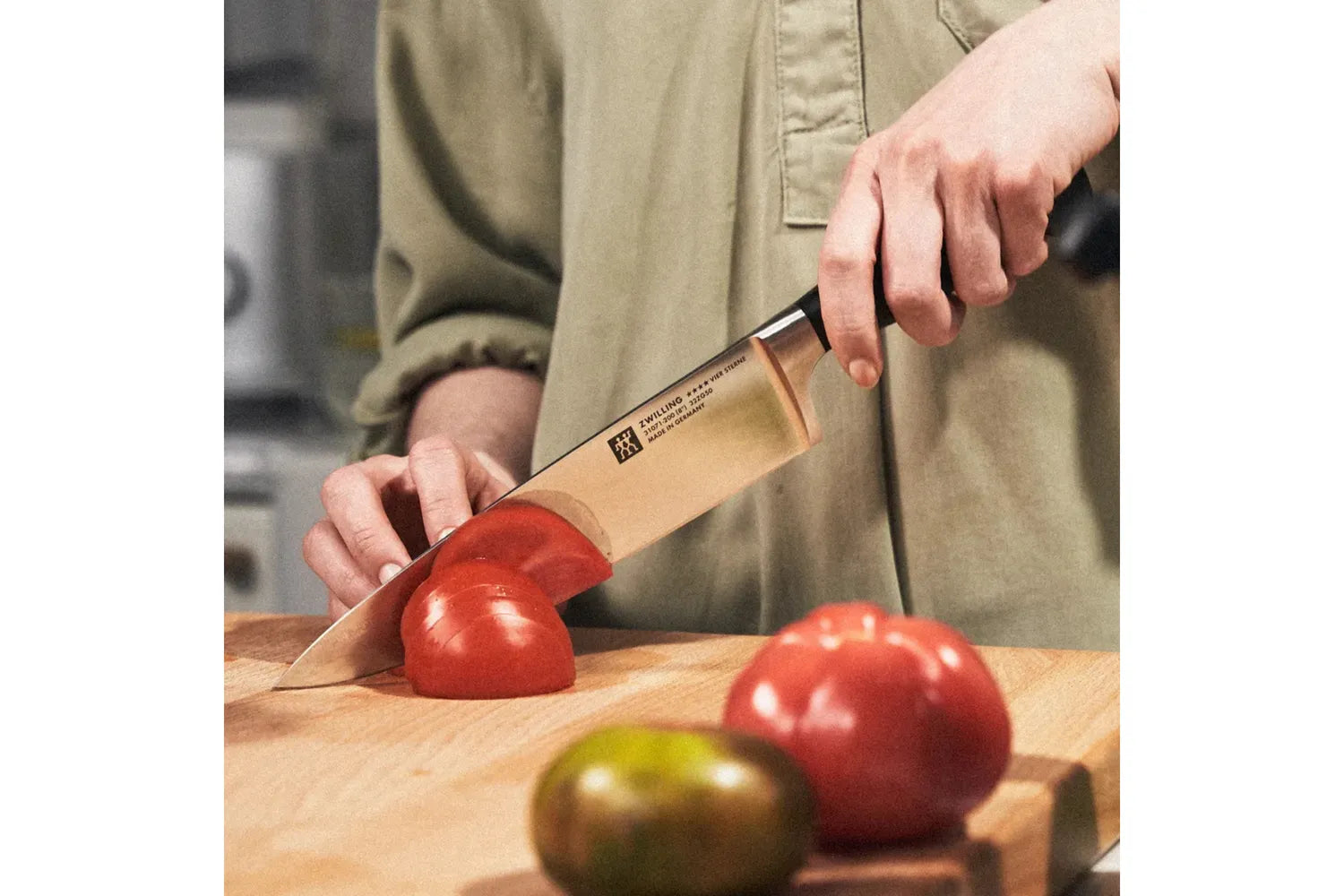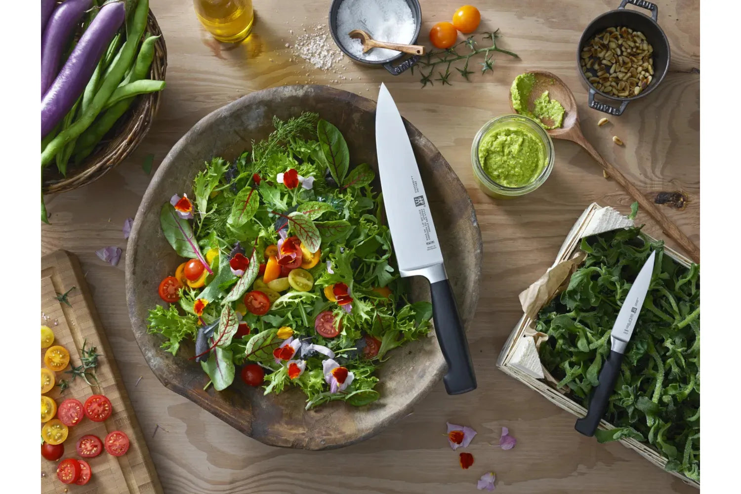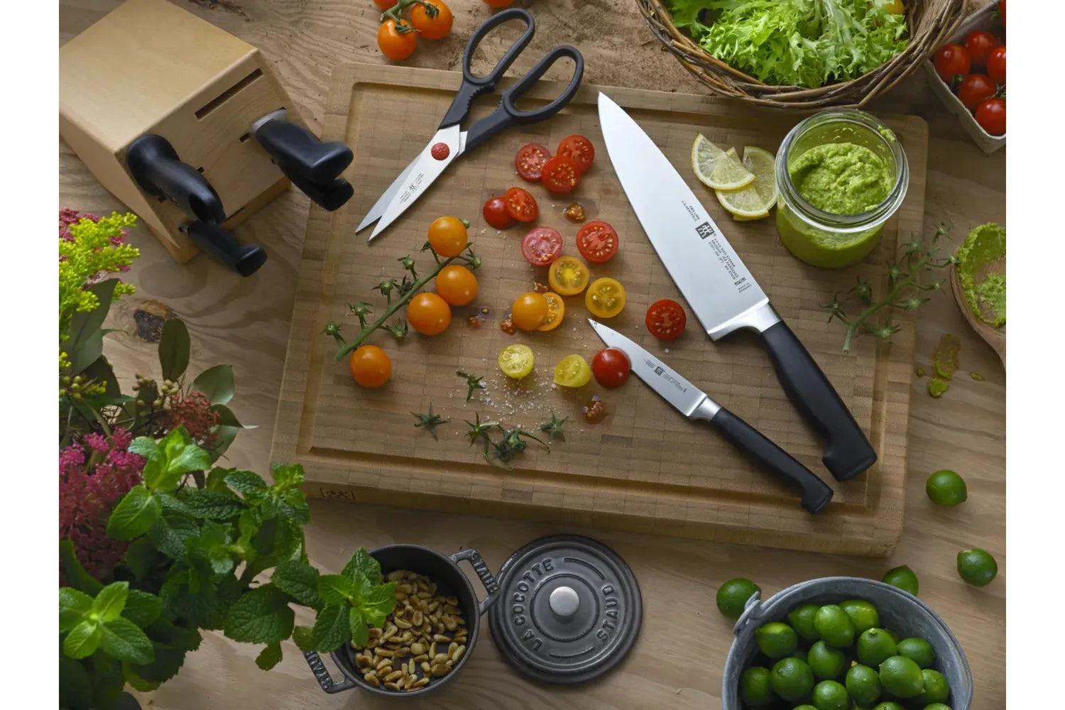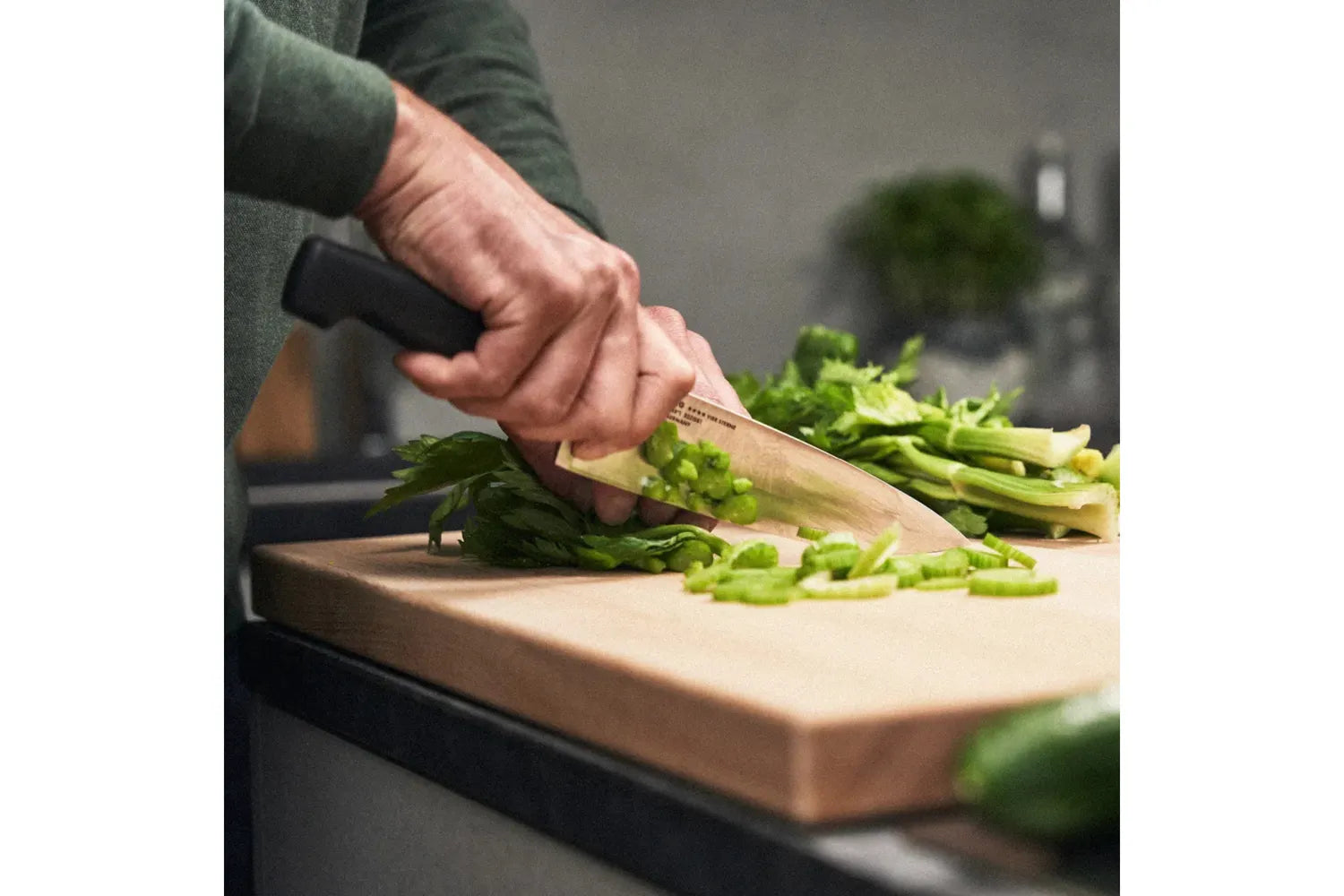 Kockens kniv från FOUR STAR®-serien är ett verktyg för en mängd köksuppgifter. Det är idealiskt för tillagning av fisk, kött, fjäderfä eller vegetariska recept och kommer att skära utan problem genom alla ingredienser. Det 20 cm bladet gör det speciellt lämpat för att tillverka ingredienser i större storlekar, som att fin skära upp stora köttbitar eller hugga upp större grönsaker. Ett special utvecklat stål som är rostfritt och robust ger kniven sina enastående egenskaper. En ishärdad yta förbättrar materialet ytterligare för att möjliggöra en precisionskant för skärpa. Det är då lätt att skära upp ingredienser med kockens kniv från ZWILLING. Handtaget är ergonomiskt utformat för att sitta bekvämt i handen och göra även svåra uppgifter lätta. En kantlös övergång från handtag till bolster förbättrar också användningen.