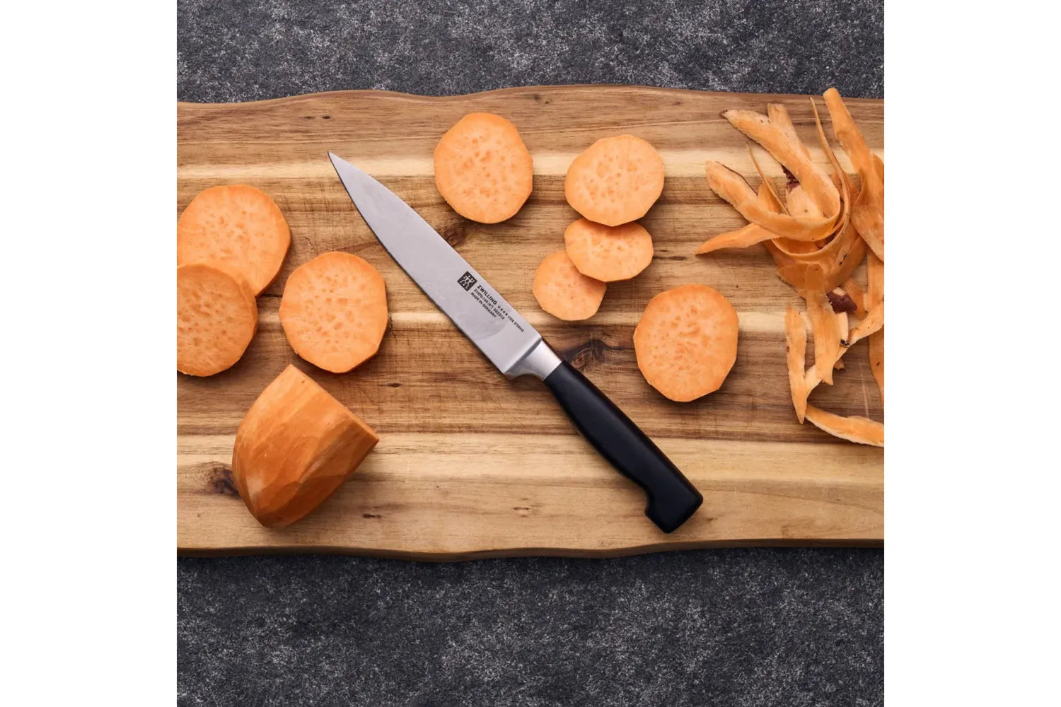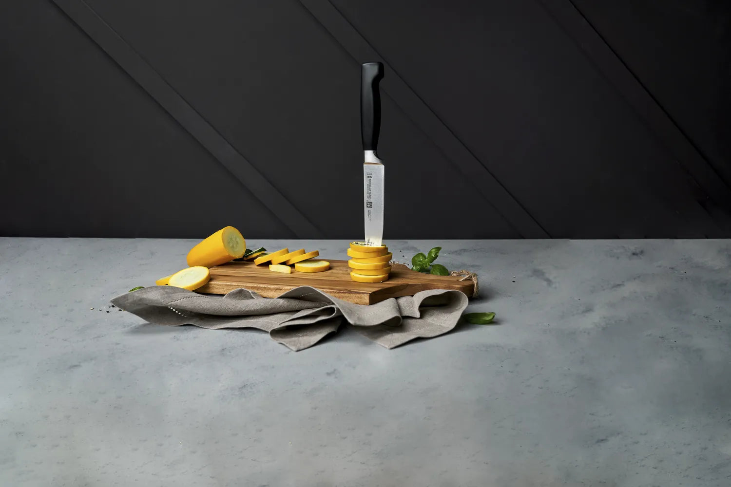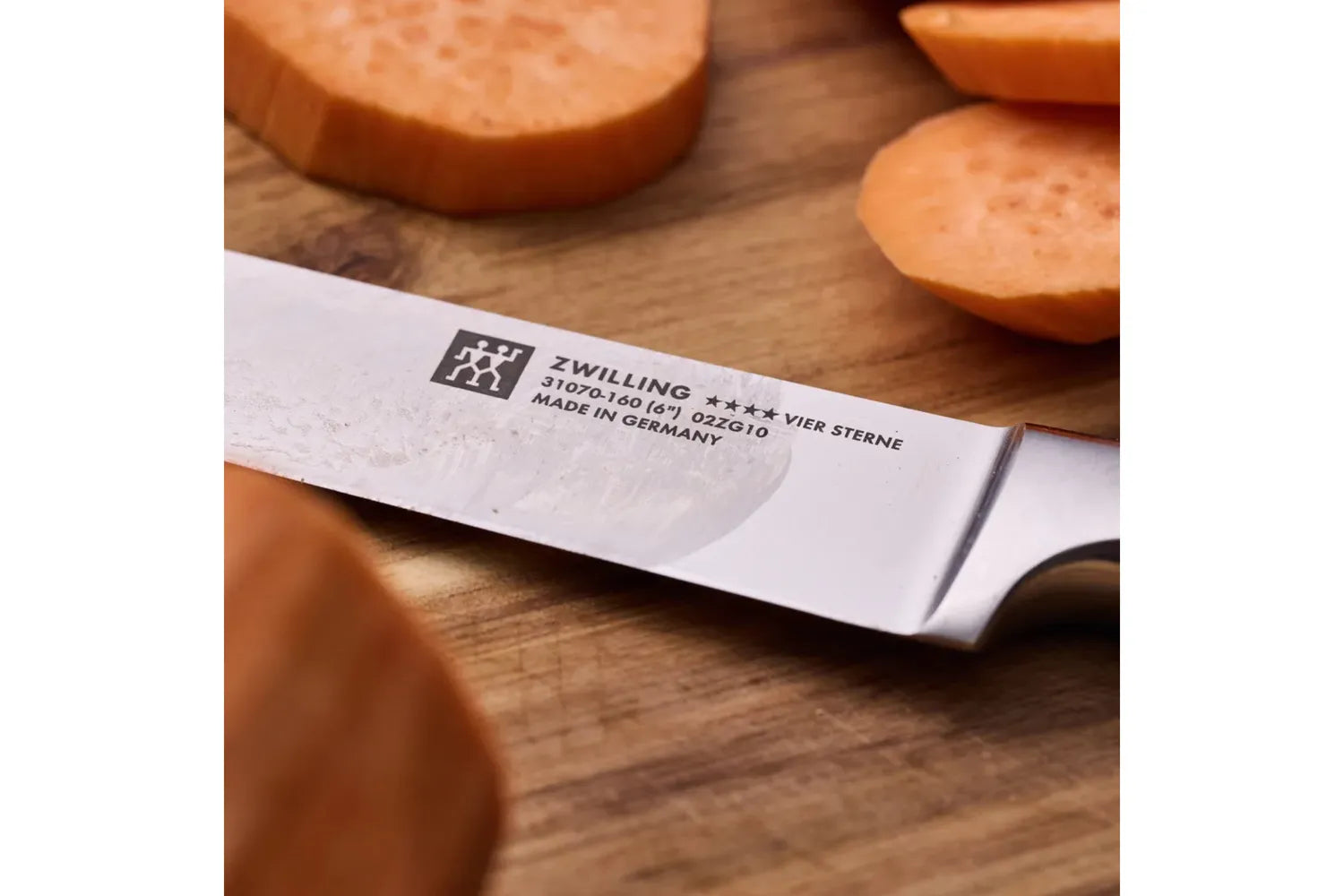 Den praktiska filé/köttkniven från ZWILLING är användbar när du vill servera kött i supertunna skivor. Det 16 cm långa bladet har en slät egg, ergonomiskt plasthandtag som ger dig en hög säkerhetsnivå när du arbetar i köket. Kniven är en del av ★★★★ ®Four Star-serien. En speciell formel ger det raffinerade och ishärdade rostfria stålet. Bolstret och handtagets tyngd garanterar också en välbalanserad kniv. SIGMAFORGE®-knivens noggrannare stålblad gör exakt skärning möjligt och resulterar i rena och jämna snitt. Den smala kniven är särskilt användbar för att skära, putsa eller förbereda kötträtter.