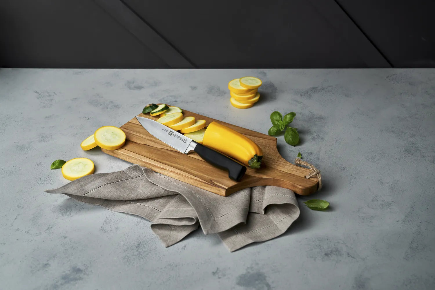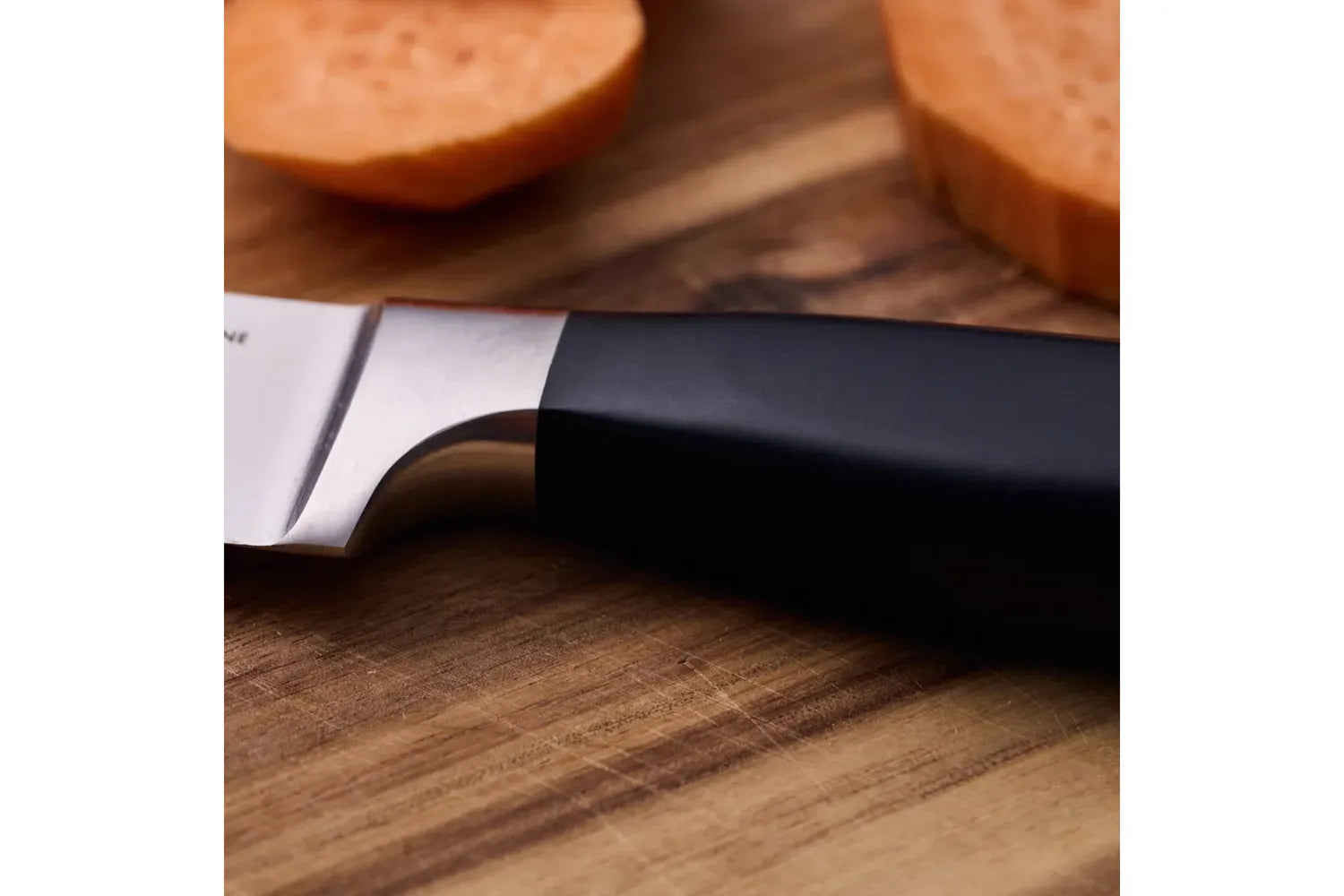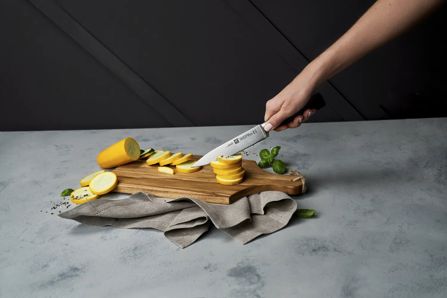 Den praktiska filé/köttkniven från ZWILLING är användbar när du vill servera kött i supertunna skivor. Det 16 cm långa bladet har en slät egg, ergonomiskt plasthandtag som ger dig en hög säkerhetsnivå när du arbetar i köket. Kniven är en del av ★★★★ ®Four Star-serien. En speciell formel ger det raffinerade och ishärdade rostfria stålet. Bolstret och handtagets tyngd garanterar också en välbalanserad kniv. SIGMAFORGE®-knivens noggrannare stålblad gör exakt skärning möjligt och resulterar i rena och jämna snitt. Den smala kniven är särskilt användbar för att skära, putsa eller förbereda kötträtter.