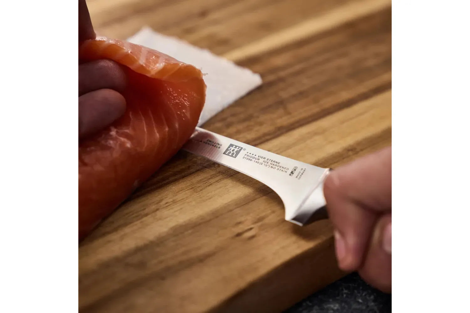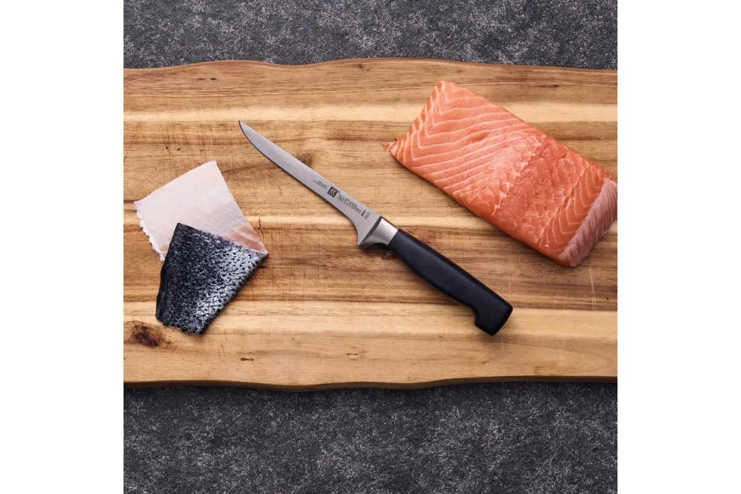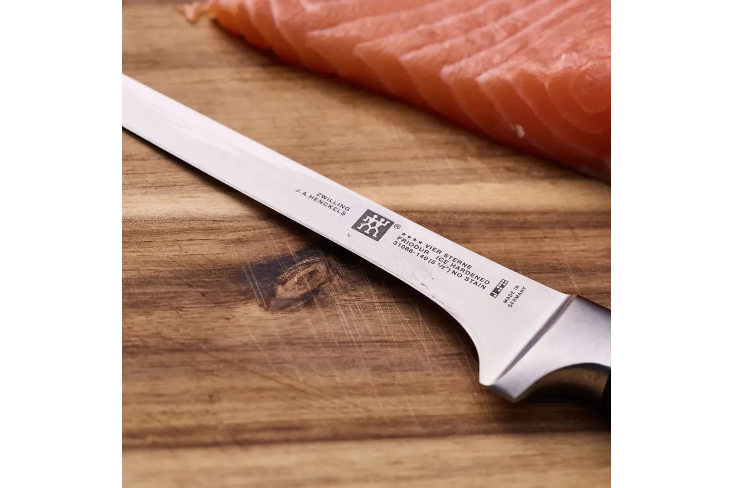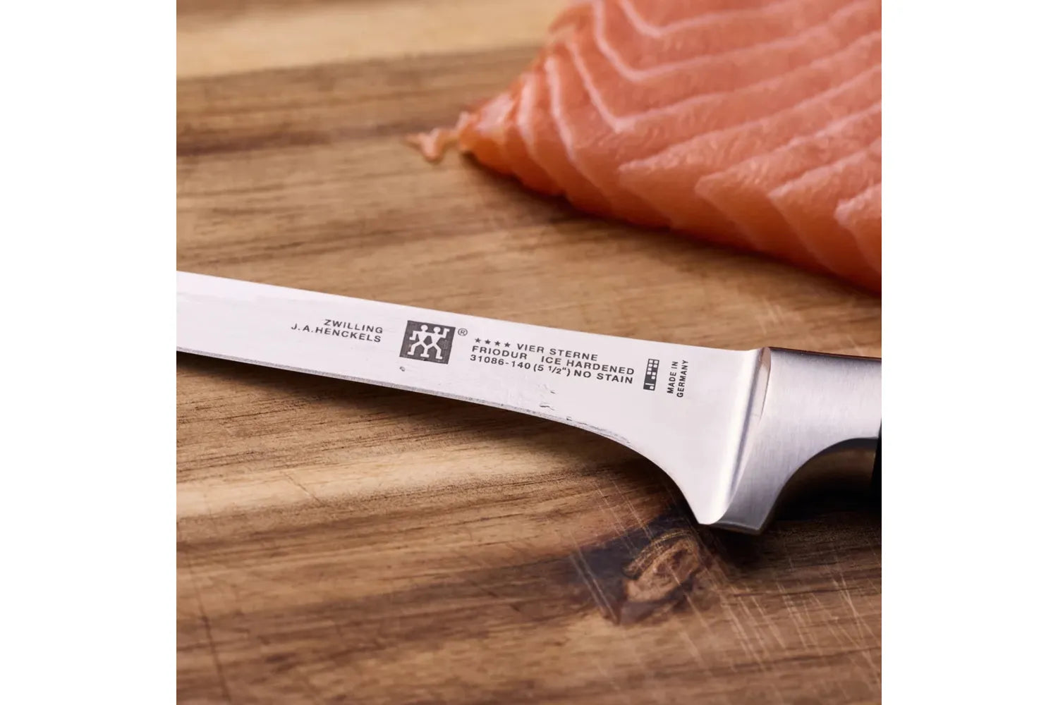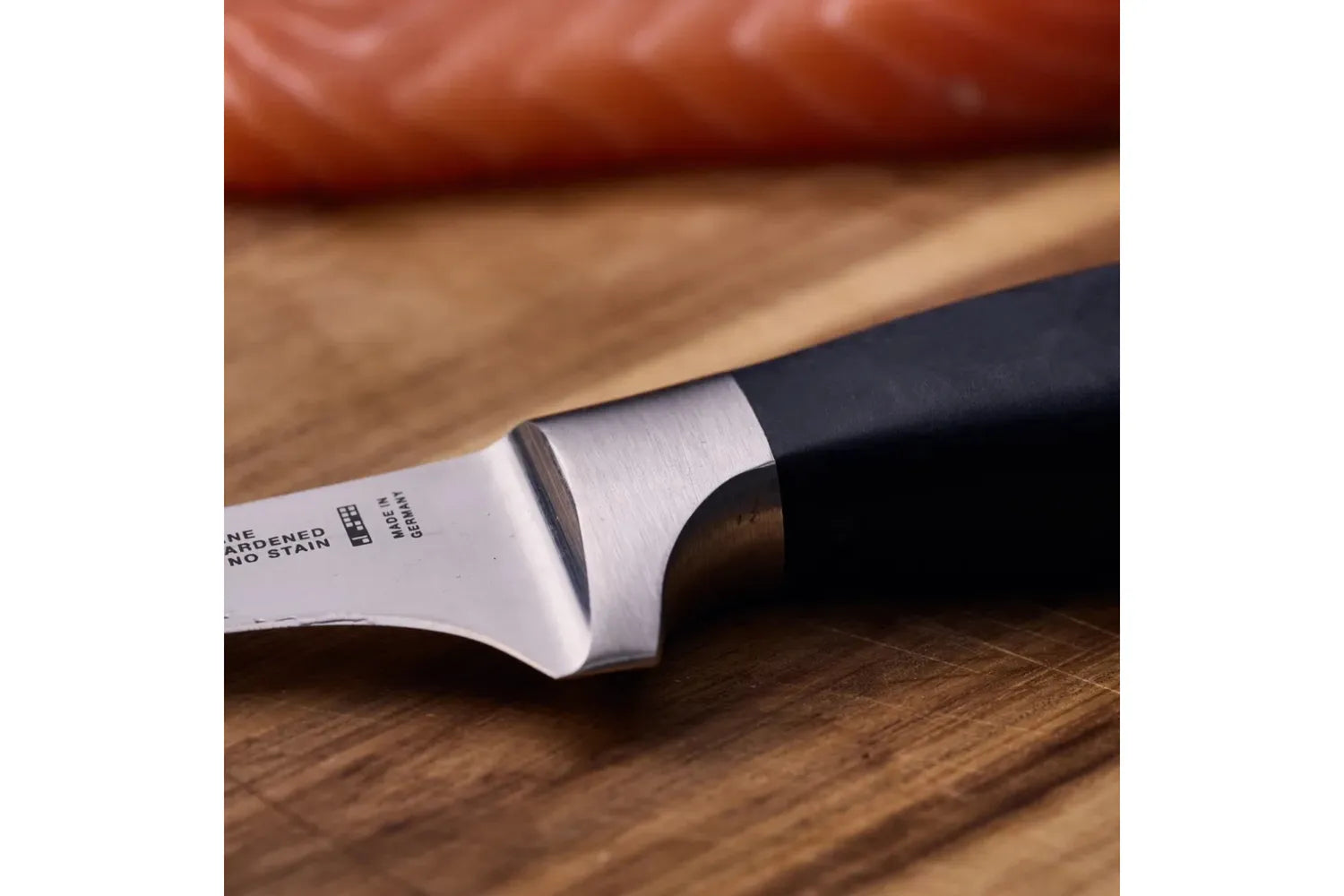 FOUR STAR är den mest sålda knivserien från ZWILLING J.A. Henckels över hela världen. Denna berömda kollektion är hedrad och handbehandlad av de mest skickliga hantverkarna och är modellen för säkerhet, ergonomi och komfort. Tack vare sin sömlösa övergång från bolster till handtag är knivarna bekväma att använda under lång tid. Stödet ger rätt balans medan de fungerar som en säker fingeravskärmning. Knivarna är tillverkade av specialutvecklat specialformelstål som har perfekterats i över 280 år. Kombinerat med ZWILLINGs signatur ishärdningsteknik är dessa FRIODUR-blad hårdare, skarpare, de kommer INTE STÅNG eller spån och de behåller sin skärpa längre. SIGMAFORGE-knivarna är precisionssmidda från ett enda stålstycke och har ett exceptionellt robust, balanserat och flexibelt blad.