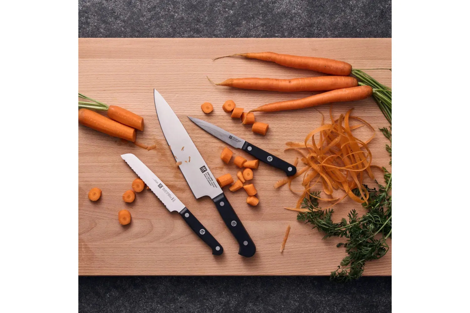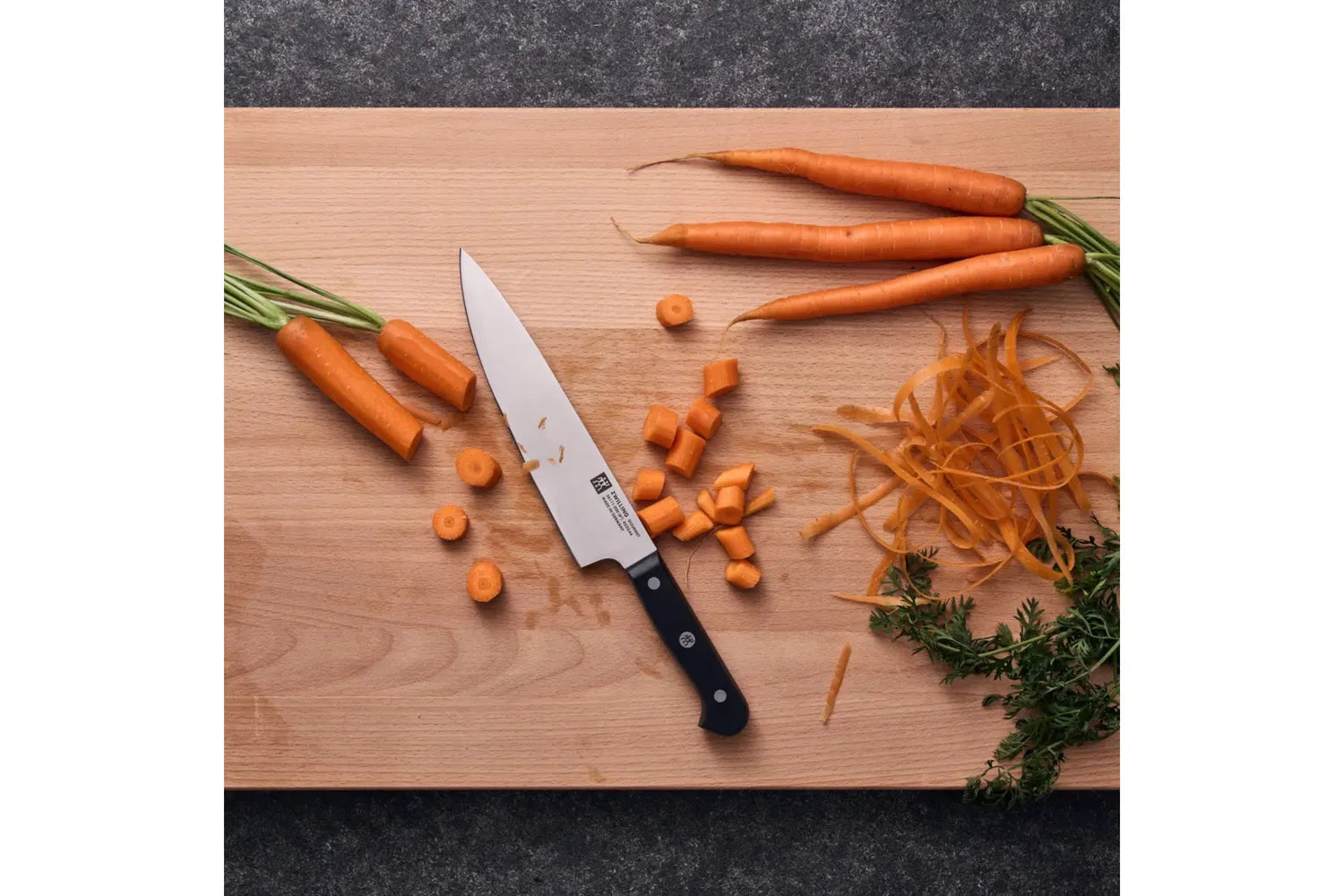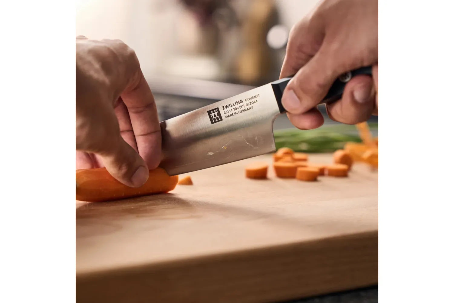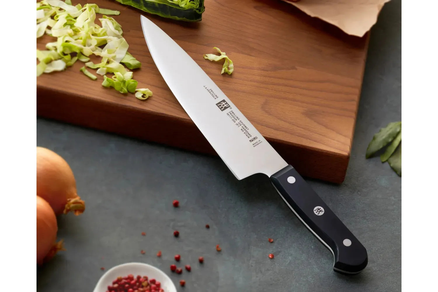 Den premiumbestickpionjären ZWILLING J.A. Henckels har tillverkat anmärkningsvärda knivar sedan 1731. Företaget är en innovatör i branschen och håller sig tro mot sina rötter: ett starkt engagemang för kvalitet och excellens. ZWILLING Gourmet är den bästa kniven för hemmakockar som vill ha sin vardag vara exceptionellt. Den enstaka, precisionsstämda bladkonstruktionen är lättare än smidda knivar, vilket möjliggör maximal manövrerbarhet. Knivarna är tillverkade i Tyskland och är tillverkade i specialformelstål som har perfekterats i över 285 år. Kombinerat med ZWILLINGS signatur ishärdningsteknik är bladen hårdare, skarpare, de kommer inte att fläcka eller spånar och de behåller sin skärpa längre. Det ergonomiska, trippelnitshandtaget garanterar trötthetsfri skärning. Upplev komforten, hållbarheten och skärpan hos ZWILLING Gourmet.