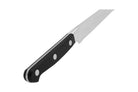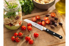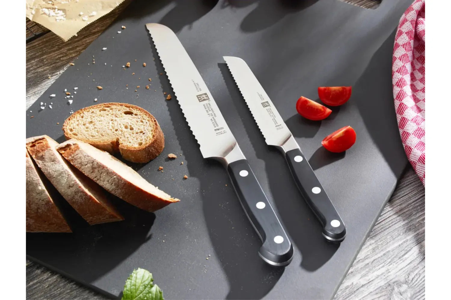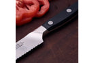 ZWILLING Pro är den mest användarvänliga kniven som finns tillgänglig på marknaden. Den unika knivformen och den ergonomiska styrkan är resultatet av 280 års erfarenhet av knivtillverkning och den noggranna studien av hur knivar används. En unik krökt bult stödjer det professionella nypgreppet, med tummen och pekfingret på bladet, för säker skärning och mindre trötthet. Bladet omdesignades med en bredare kurva i framsidan för att underlätta gungningsrörelsen av västerländsk skärning, medan rak rygg är idealisk för den asiatiska huggningsrörelsen. Bladets fulla längd kan användas vid skärning och kan skärpas från bult till spets Designad i Italien av Matteo Thun och tillverkad i Tyskland av ZWILLING J.A. Henckels, företaget som sätter standarden för exceptionella bestick över hela världen. ZWILLING Pro 5 "Serrated Utility Knife är perfekt för livsmedel med ett tufft yttre och mjukt interiör som tomater, korv och rullar.