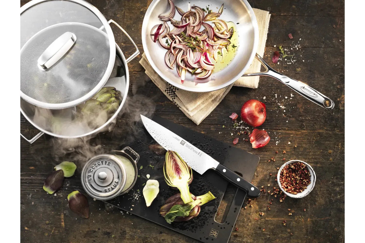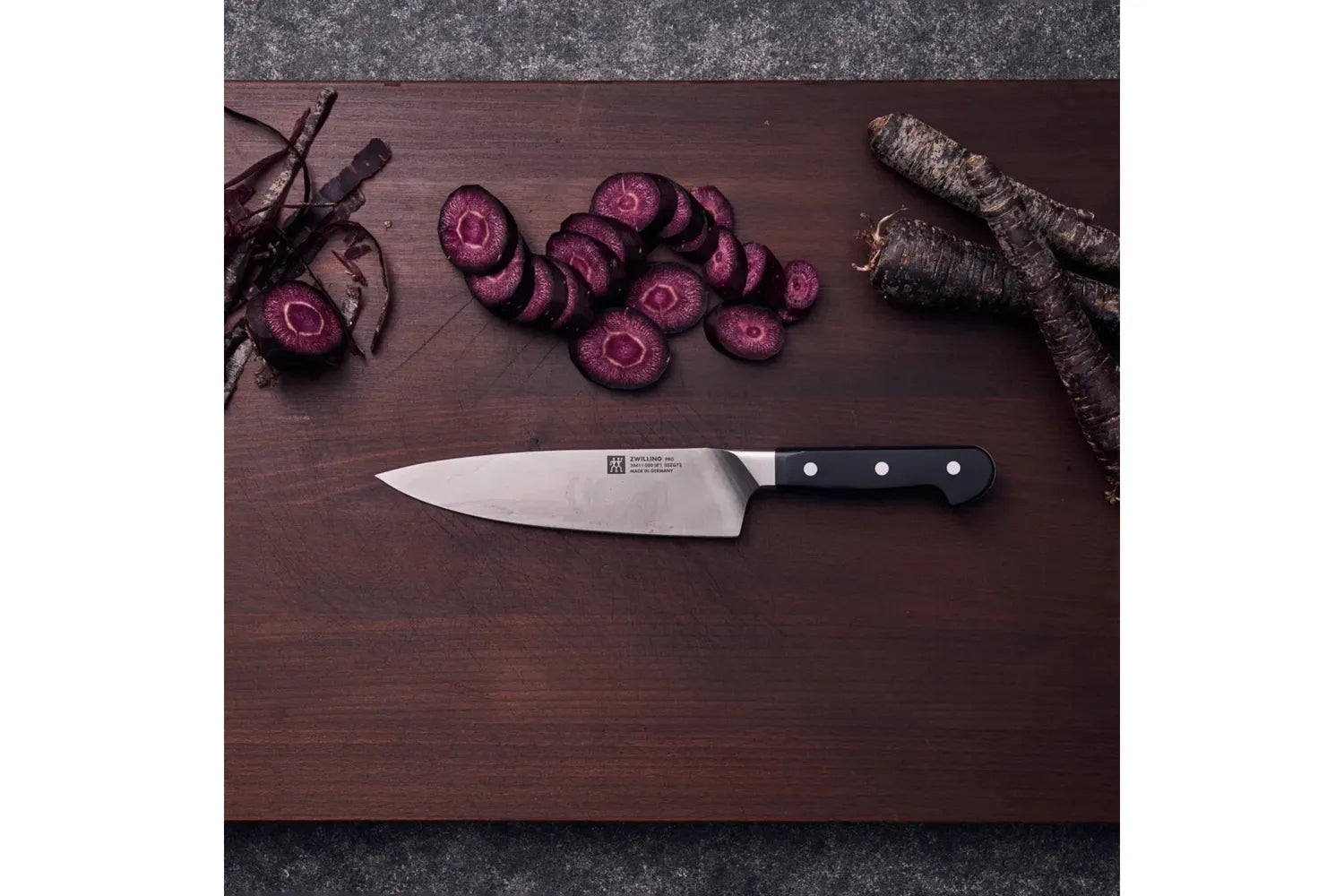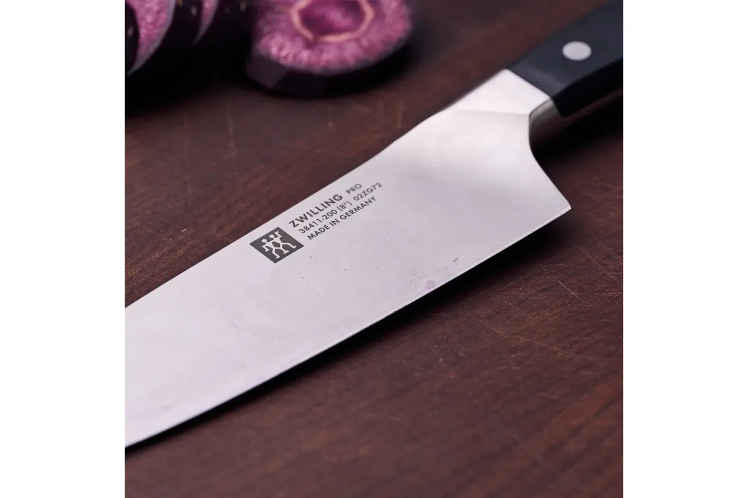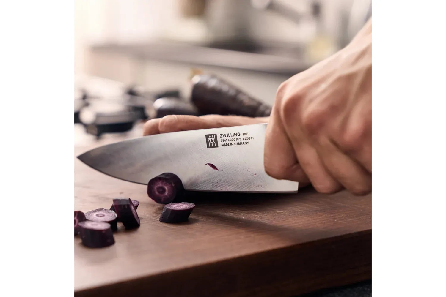 ZWILLING kockknivar förenar hantverk av hög kvalitet och innovativ design med material av hög kvalitet. Det ergonomiska handtaget på denna ZWILLING® Pro kockkniv är bekväm att hålla och bidrog till den imponerande funktionen hos denna traditionella 20 cm kniv. Kniven är smidd av ett enda stålstycke, dess FRIODUR®-blad härdad med en speciellt utvecklad ishärdningsprocess, som också ger kniven dess exceptionella robusthet och skärpa. Sömlöst flytande ytor förhindrar att bakterier samlas, vilket gör kniven ren och hygienisk att använda. Denna ZWILLING® Pro kockkniv gör det enkelt att få ett korrekt snitt.