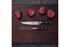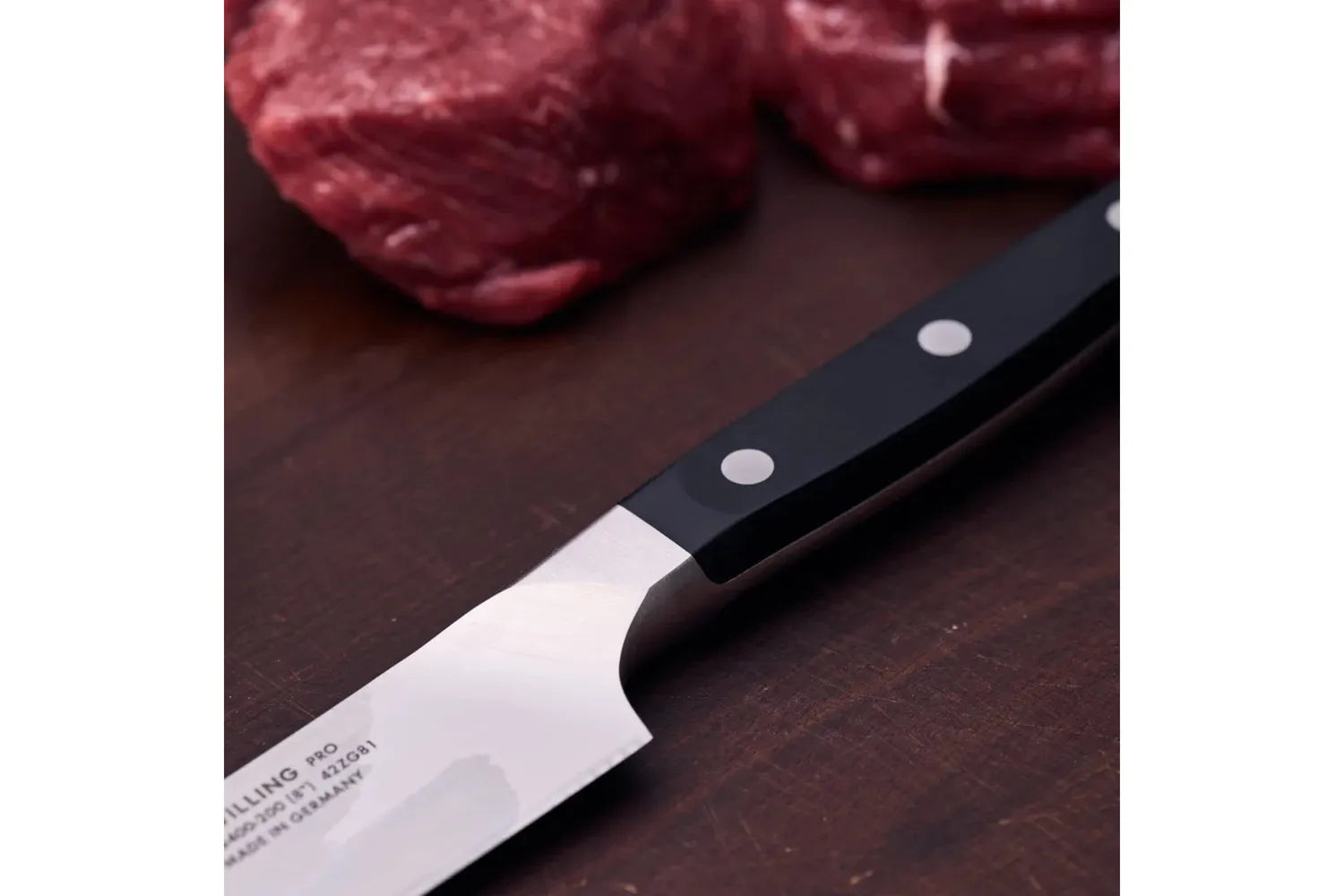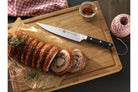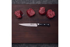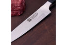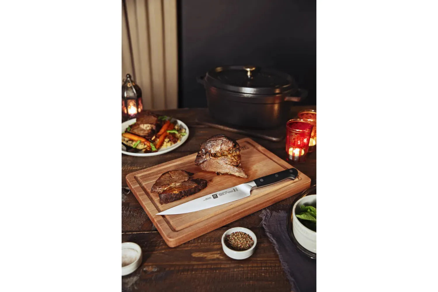 ZWILLING Pro är den mest användarvänliga kniven som finns tillgänglig på marknaden. Den unika knivformen och den ergonomiska styrkan är resultatet av 280 års erfarenhet av knivtillverkning och den noggranna studien av hur knivar används. En unik krökt bult stödjer det professionella nypgreppet, med tummen och pekfingret på bladet, för säker skärning och mindre trötthet. Bladet redesignades med en bredare kurva i framsidan för att underlätta gungningsrörelsen av västerländsk skärning, medan rak rygg är idealisk för den asiatiska huggningsrörelsen. Bladets fulla längd kan användas vid skärning och kan skärpas från bult till spets Designad i Italien av Matteo Thun och tillverkad i Tyskland av ZWILLING J.A. Henckels, företaget som sätter standarden för exceptionella bestick över hela världen. ZWILLING Pro 8 "snidkniv har ett långt, smalt blad för exakta skivor.