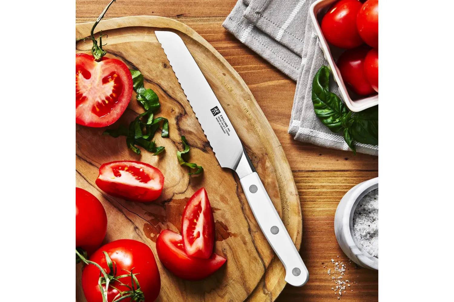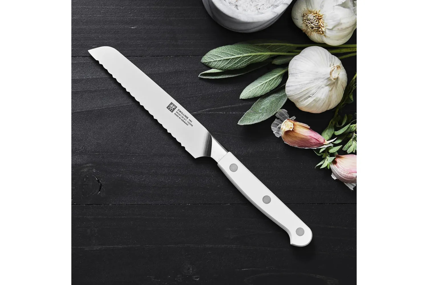 ZWILLING PRO LE BLANC: Symbios av prestanda och enastående estetik. Premiumknivar som förenar enastående prestanda med högsta krav. Designade av Matteo Thun & Antonio Rodriguez i Milano. Handtag i elegant vitt med tre nitar. Kniven har ett karakteristiskt böjt bolster. Det ger en optimal balans och exakta, mästerliga skärresultat. Med sin vågslipning kan universalkniven skära många olika livsmedel med hårt skal och mjuk kärna.