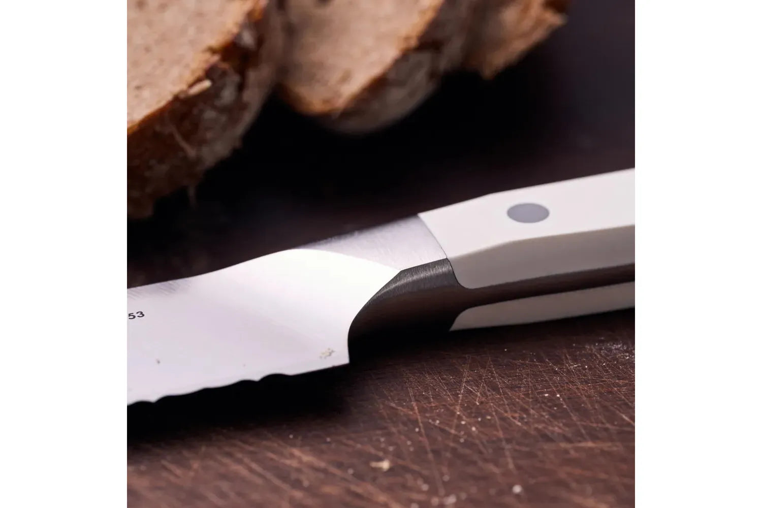 Brödkniven från ZWILLING Pro Le Blanc-serien kombinerar alla de funktioner som ambitiösa kockar förväntar sig av knivar i världsklass; kompromisslös kvalitet, design och skärpa. Med denna brödkniv kan du skära allt från stora brödlimpor till melon, med den vassa tandade kanten som enkelt sågar igenom skorpor och skal. Kniven har designats i Milano av designduon Matteo Thun och Antonio Rodriguez och tillverkats i Tyskland av vår ZWILLING specialstål.
