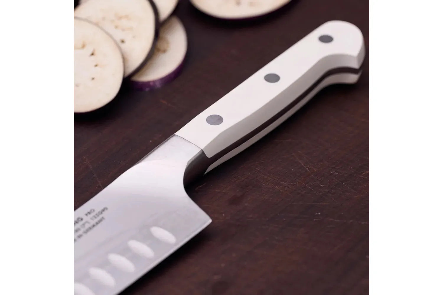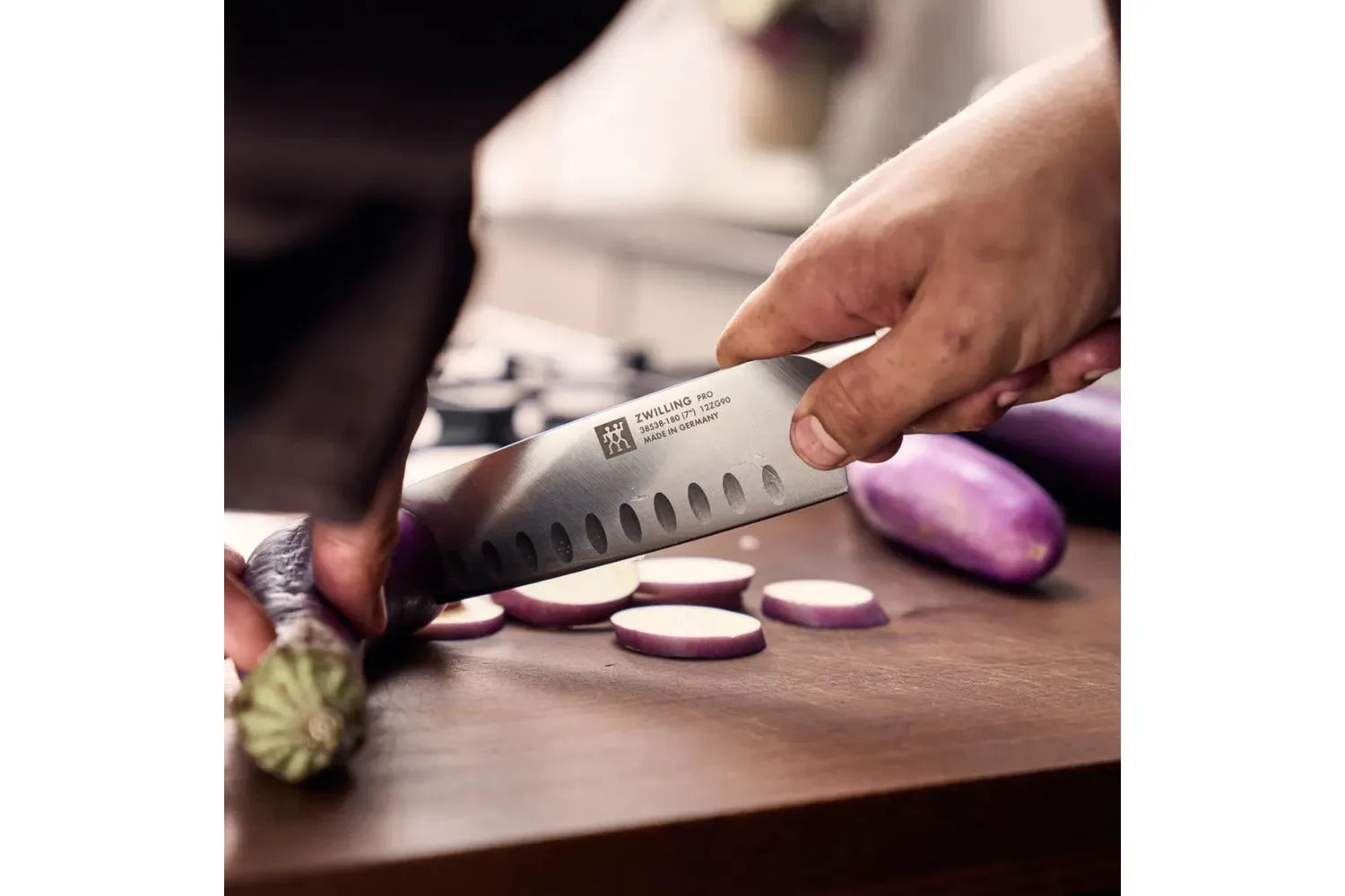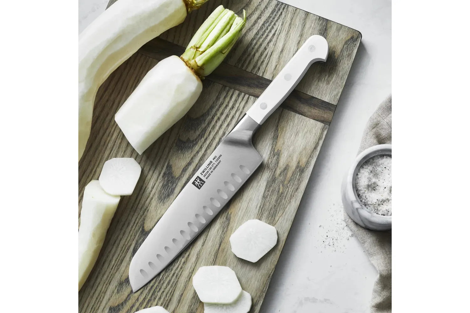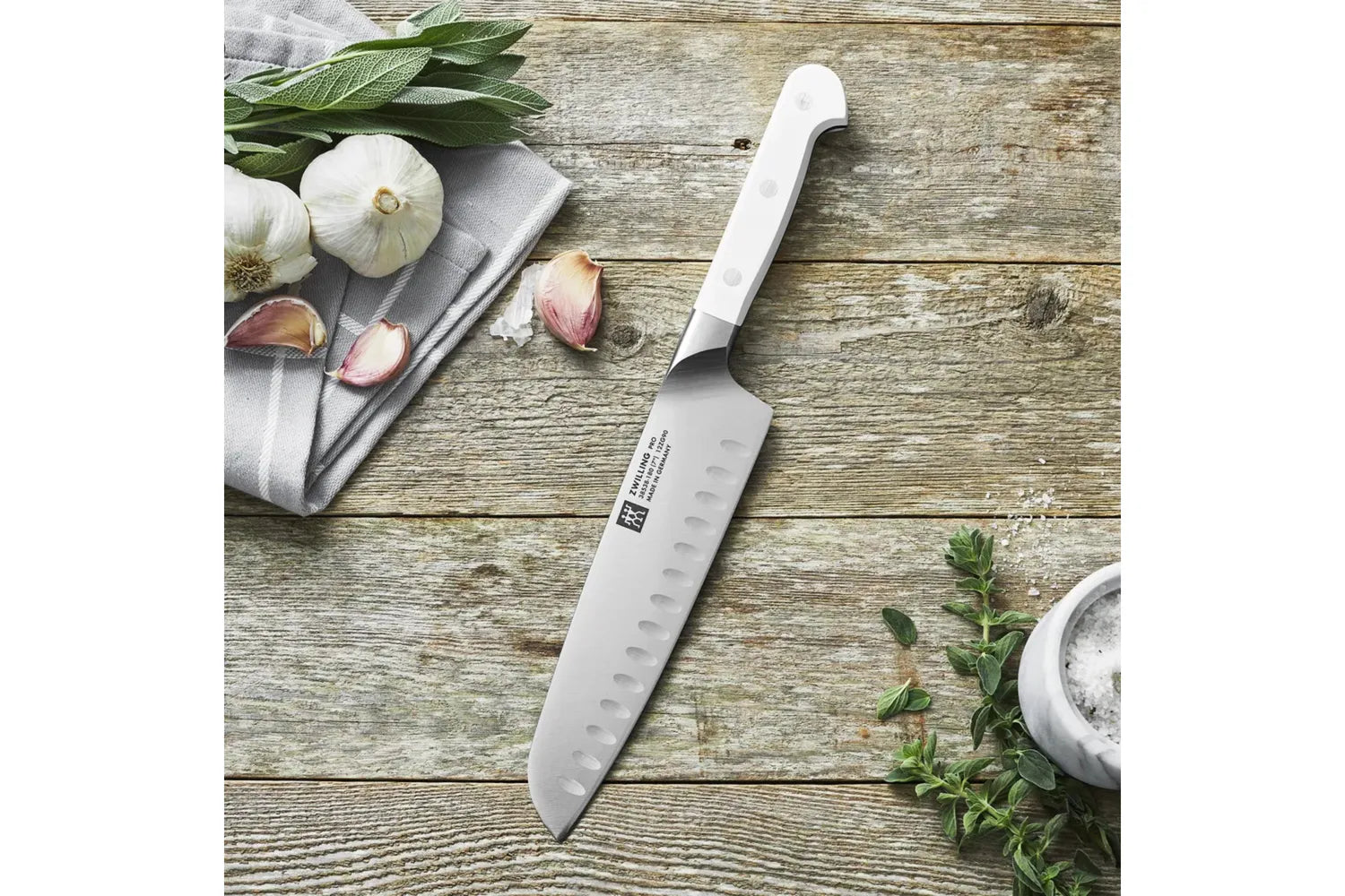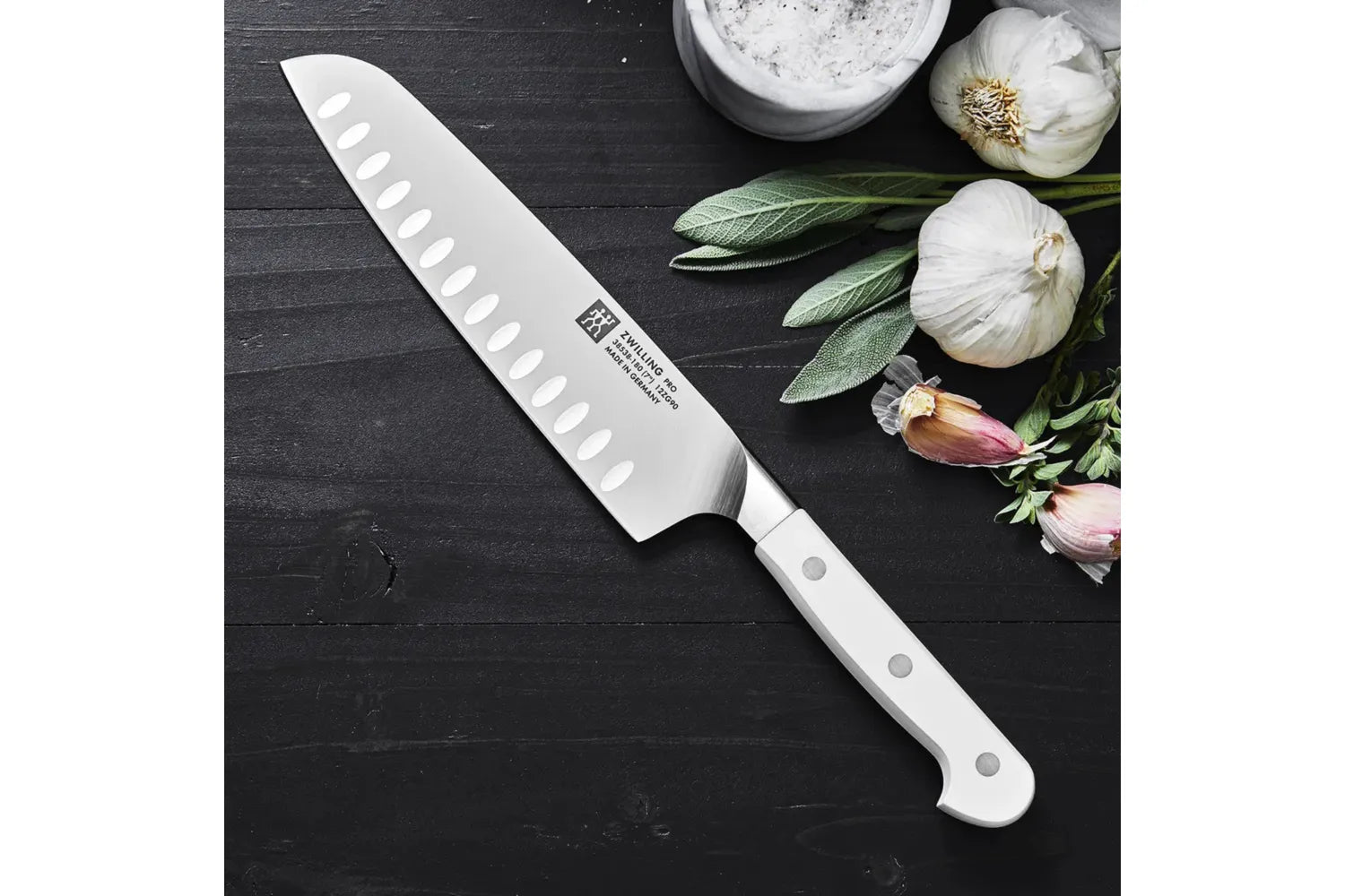 Santokun från ZWILLING Pro Le Blanc-serien kombinerar alla de funktioner som ambitiösa kockar förväntar sig av knivar i världsklass; kompromisslös kvalitet, design och skärpa. Med denna kniv kan du skära allt från kött till grönsaker, men framförallt är den med sin olivslipning optimal för råvaror som potatis som annars lätt fastnar på knivbladet. Kniven har designats i Milano av designduon Matteo Thun och Antonio Rodriguez och tillverkats i Tyskland av vår ZWILLING specialstål.