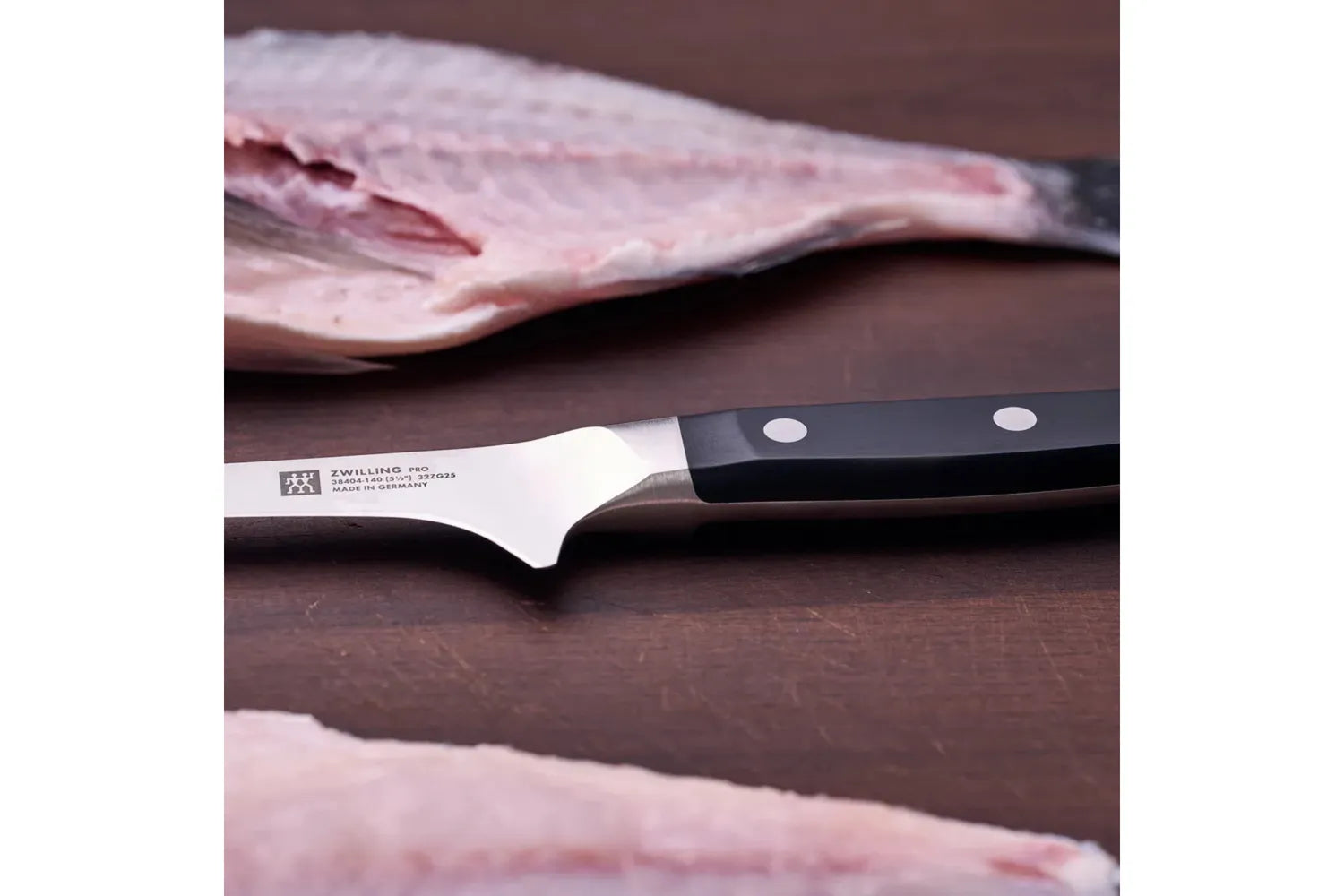 ZWILLING Pro är den mest användarvänliga kniven som finns tillgänglig på marknaden. Den unika knivformen och den ergonomiska styrkan är resultatet av 280 års erfarenhet av knivtillverkning och den noggranna studien av hur knivar används. Tillverkad i Tyskland, designad i Italien av Matteo Thun. ZWILLING Pro 5.5" Utbenningskniv med ett långt, smalt, tunt och flexibelt blad. Bäst lämpad för att skära av kött från benet.