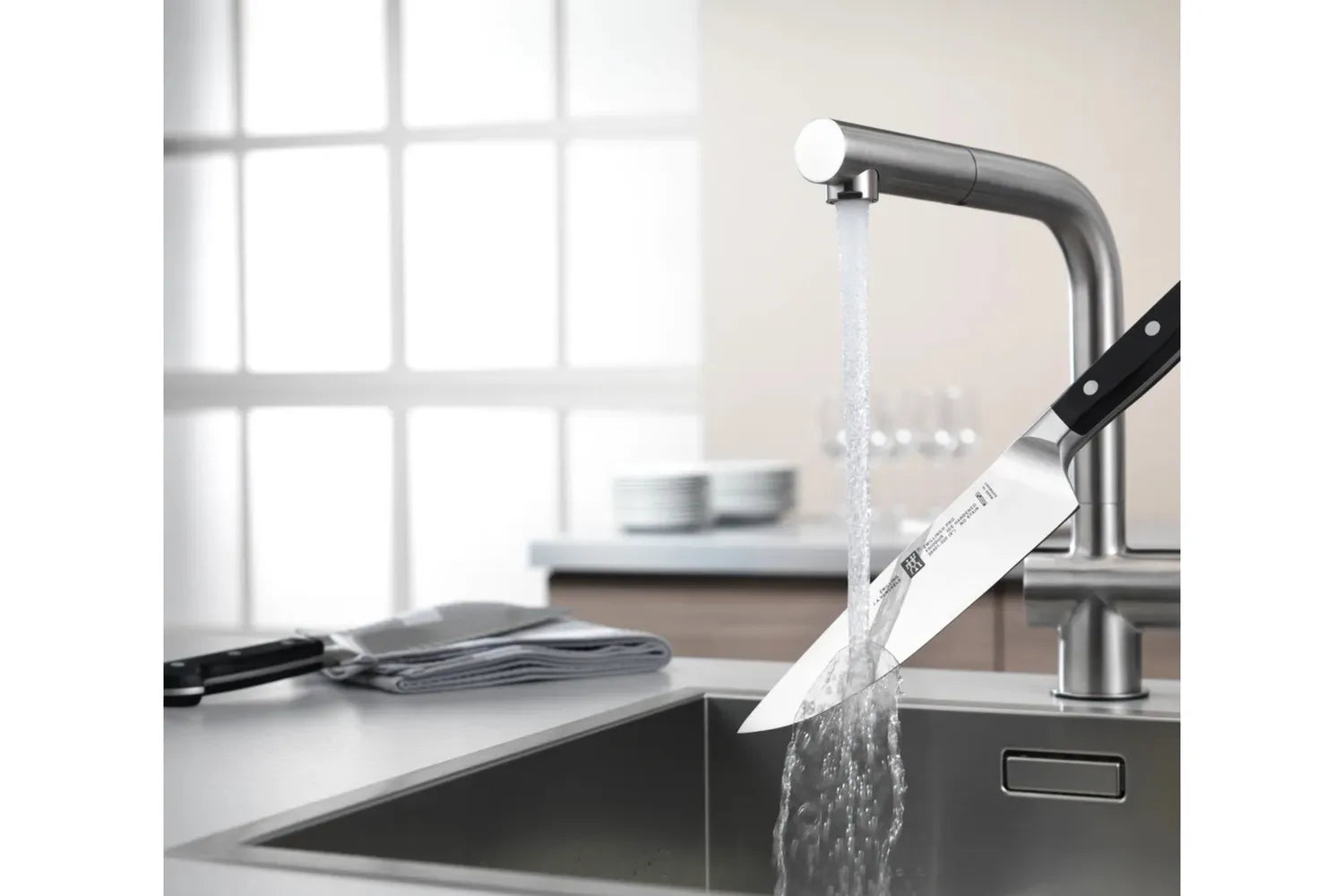 - Rengör varsamt – Tvätta kniven för hand med ljummet vatten och mild diskmedel istället för att använda diskmaskin, vilket kan skada eggen.