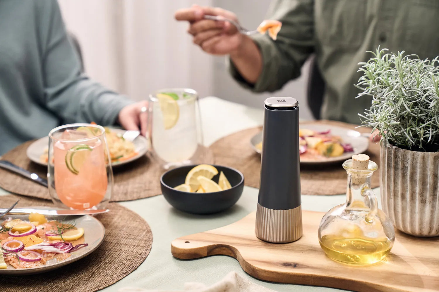 En twist när du maler kryddor. ZWILLING Spices kryddkvarn med upside-down-design i elegant grått. Kvarnverket upptill förhindrar att kryddor oavsiktligt faller ner på bord och bänkskiva. Kvarnverket består av robust keramik: extra lång livslängd och hygieniskt. Perfekt för salt, peppar och de flesta andra kryddor som chiliflingor, koriander eller senapsfrön. Med fritt inställbar malningsgrad. Oavsett om det är fint eller grovt: alltid rätt inställning för varje maträtt och för varje krydda. Särskilt bekvämt: Tack vare den extra stora påfyllningsmängden ryms extra mycket kryddor i kvarnen: längre malning, färre påfyllningar, fler smakexplosioner i köket.
