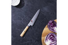 Japanska knivar är inte bara vassa, de är också estetiskt tilltalande köksredskap som inte bör fattas i din knivsamling. Denna shotoh i serien 5 MCD från MIYABI skär med sitt 14 cm långa blad korv, ost och grönsaker i perfekta skivor. Men MIYABI 5 MCD Shotoh låter dig också skära kött och fisk i mindre bitar. Kniven består av en högkvalitativ kärna av MicroCarbide-pulverstål MC63, omgiven av ett lager stål. Varje blad får den ett unikt “Flower-damaskmönster”. Varje Shotoo slipas i Seki, Japan med den klassiska Honbazuke-slipen, vilket ger en extra skärpa som får kniven att utan problem glida genom ingredienserna. Dessuomt härdas CRYODUR-bladet i en specialutvecklad process. Förutom det unikt mönstrade bladet är även handtaget i bästa masurbjörk något alldeles extra: Det är inte bara ådringen som drar blickarna till sig – trähandtaget får sin perfektion med ett snyggt mosaikstift.