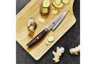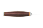 Denna 9cm långa skalkniv från Miyabi är perfekt när du vill skära, hacka och skala frukt och grönsaker. Att skära till en sallad eller förbereda läckra curryrätter med mycket grönsaker är inga problem. Knivens höga skärpa får den tack vare att knivbladet är slipat på båda sidor samt att det slutligen slipats med Honbazuke-tekniken. Shotoh skalkniv 9 cm erbjuder hög komfort och långvarig skärpa. Kniven kommer från serien MIYABI 6MCT och har ett knivblad i hamrad design, även kallad Tsuchime-look. Handtaget är tillverkat av högkvalitativt -pakkaträ och har en fin ådring. Ett extra designelement är mosaikstiftet. För att du ska kunna skära utan att trötta ut dig är kniven väl balanserad och behaglig att arbeta med. Knivbladet är tillverkat av pulverstål av mikrokarbid som har bäddats in i två andra stållager. Mittlagret har en hög hårdhet på ca 63 Rockwell. Dessutom har kniven genomgått speciella härdningsprocesser, som ishärdning vid -196 °C. Det ökar produktens stabilitet men även flexibiliteten, robustheten och hållbarheten. Därför kan du utföra många uppgifter i köket med denna bekväma och vassa kniv utan att trötta ut dig och utan överdriven ansträngning.