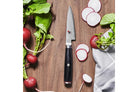 Japanska knivar är mönsterexempel på elegans, skönhet och skärpa. Den autentiska japanska precisionskniven Shotoh i serien MIYABI 5000FCD utmärker sig med en ovanliga hårdhet på 61 HRC och en utmärkt skärpa, med säker och bekvämt hantering samt ett tilltalande, estetiskt utseende. Det 9 cm långa bladet består av ett FC61-kärnlager som är inbäddat i 48 lager stål. Det ger ett mycket vackert damastmönster, som är unikt för varje kniv. Det hårda, flexibla och skärpebeständiga bladet i Shotoh-kniven består av ett specialstål, som består av ett avvägt förhållande mellan krom och stål. Den FRIODUR®-märkta kniven ishärdas även dubbelt, vilket ger kniven dess höga kvalitet. Det gör den extremt tålig och korrosionsbeständig. Honbazuke-slipstenen ger kniven en sista slipning, som ger bladet en ovanlig skärpa, fullt jämförbar med en rakkniv. Shotoh-knivens bekväma, ergonomiskt utformade D-handtag är gjord i slitstarkt pakkaträ. Denna japanska precisionskniv blad och handtag har optimal balans och kontroll, så att du kan skära med alla tekniker utan att trötta ut handen. Med den fina och ultravassa bladet på Shotoh i serien MIYABI 5FCD rensar och skär du frukt eller grönsaker på ett kontrollerat och bekvämt sätt.
