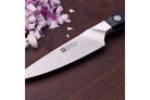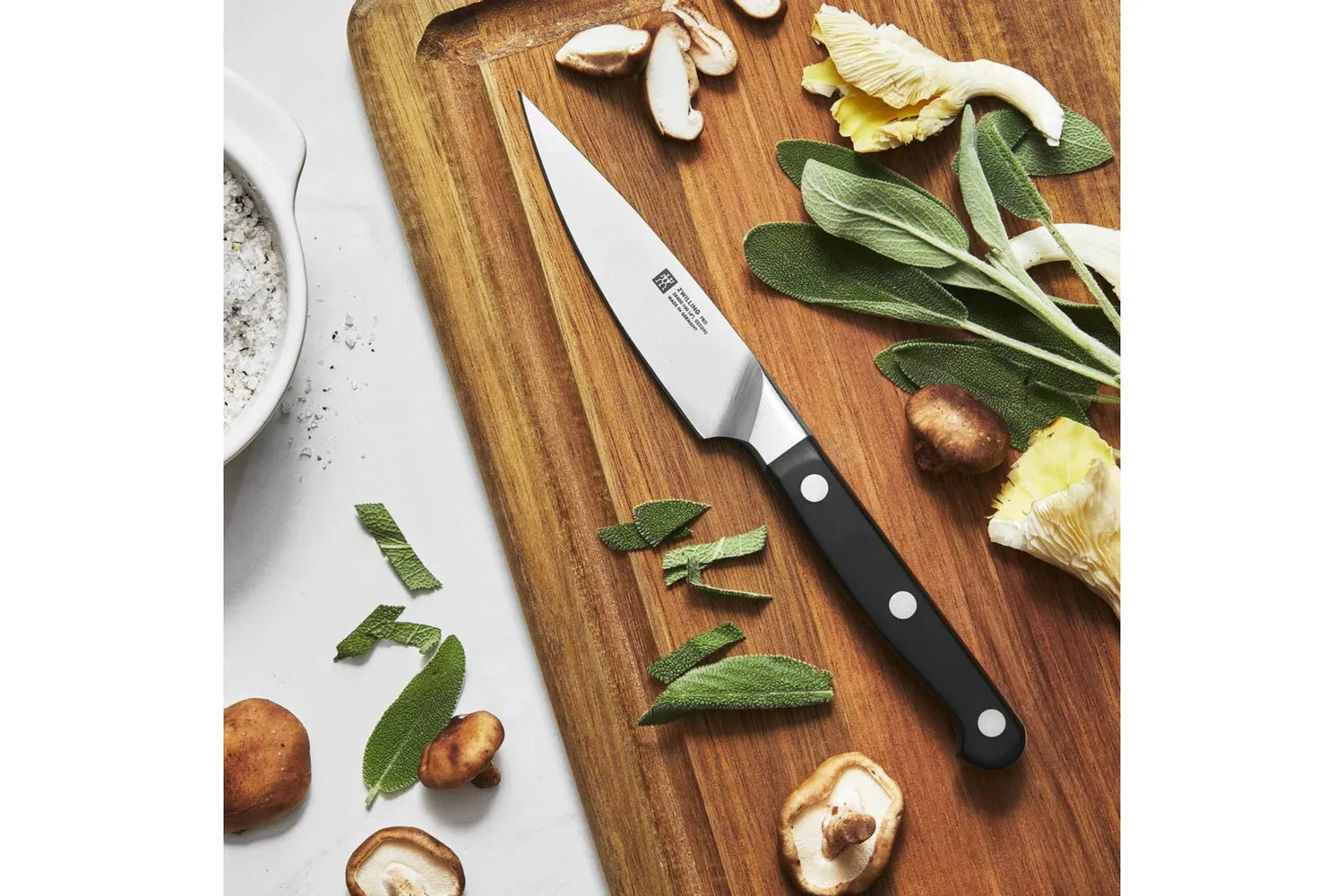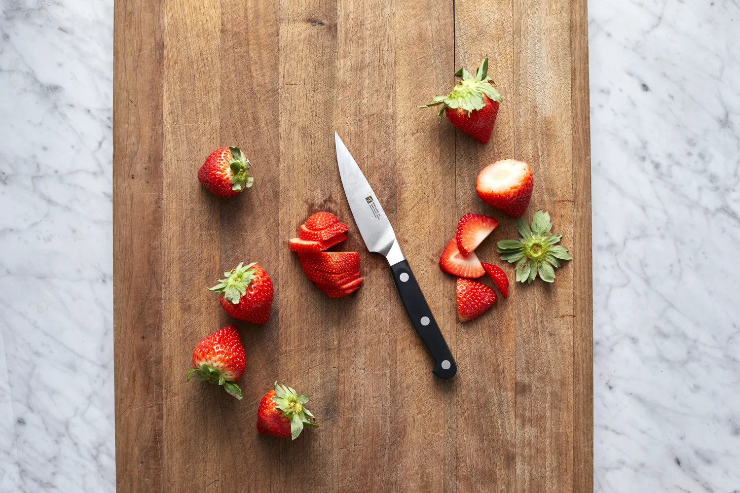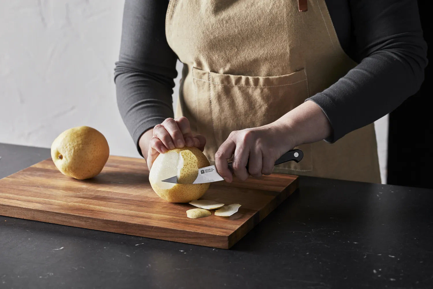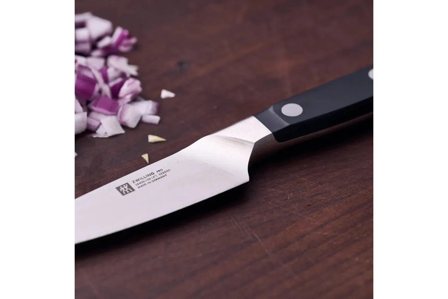 ZWILLING Pro är den mest användarvänliga kniven som finns tillgänglig på marknaden. Den unika knivformen och den ergonomiska styrkan är resultatet av 280 års erfarenhet av knivtillverkning och den noggranna studien av hur knivar används. En unik krökt bult stödjer det professionella nypgreppet, med tummen och pekfingret på bladet, för säker skärning och mindre trötthet. Bladets fulla längd kan användas vid skärning och kan skärpas från bult till spets Designad i Italien av Matteo Thun och tillverkad i Tyskland av ZWILLING J.A. Henckels, företaget som sätter standarden för exceptionella bestick över hela världen. ZWILLING Pro Paring Knife är en liten kniv med ett starkt blad och mittspets. Den är idealisk för rengöring, skalning och skärning av små frukter och grönsaker.