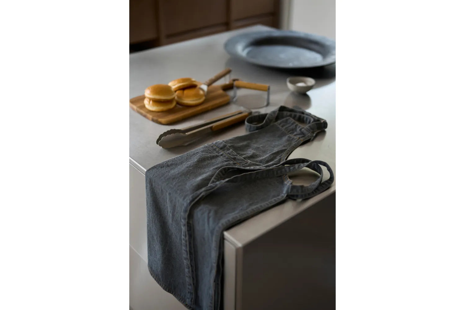 Den grå denimfinishen ger ett modernt och professionellt uttryck som passar lika bra i det minimalistiska köket som vid utomhusgrillen. Materialet andas naturligt och blir mjukare med tiden utan att kompromissa med hållbarheten.
