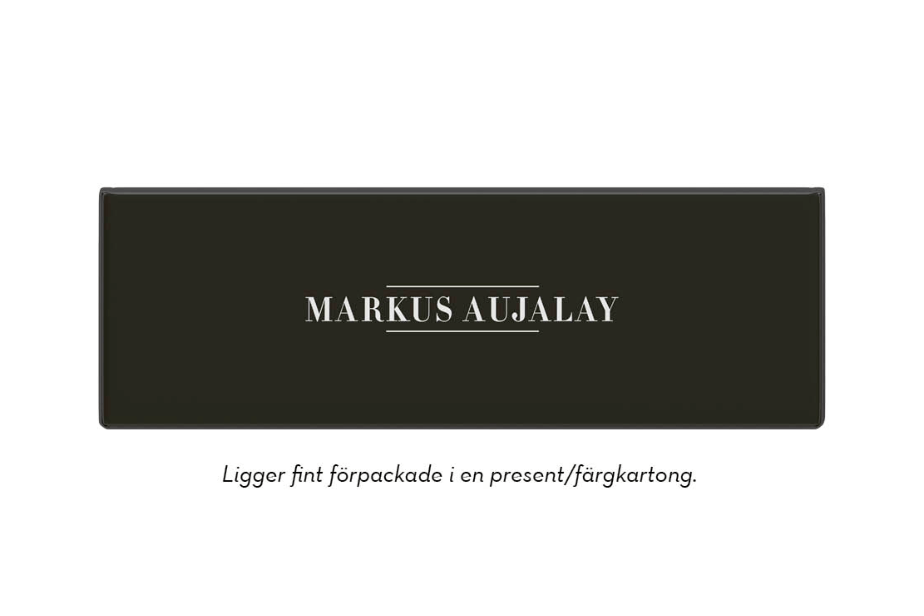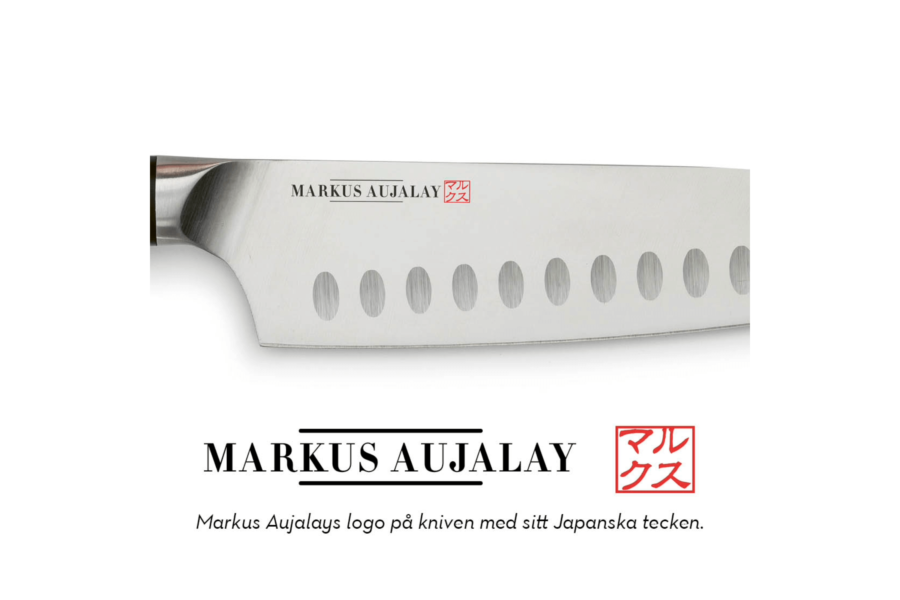 Kockkniven är utrustad med ett greppvänligt svart handtag som ligger stabilt i handen, vilket gör den både säker och bekväm att använda även under längre matlagningspass. På bladet pryds Markus Aujalays logotyp, vilket ger kniven en snygg och exklusiv karaktär – en symbol för kvalitet och matglädje.