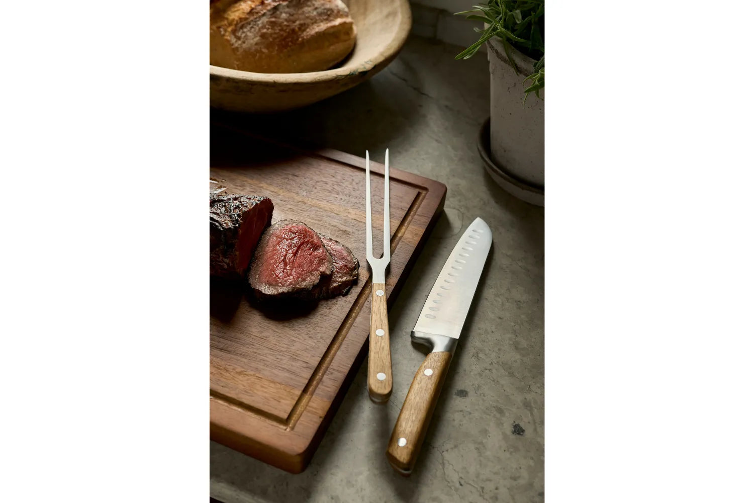 Santokukniven har ett 18 cm långt blad i rostfritt stål som ger rena snitt och hög kontroll, medan handtaget i akacia ligger tungt och stabilt i handen. Trancheringsgaffeln är perfekt balanserad för att hålla råvaran stadigt på plats vid uppskärning. Tillsammans skapar de en harmonisk arbetsupplevelse som gör varje servering till ett hantverk.