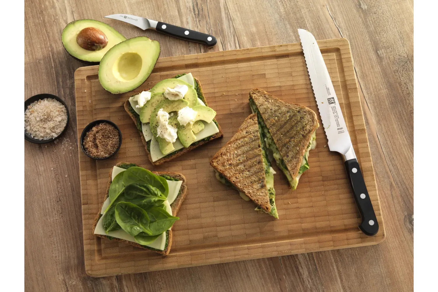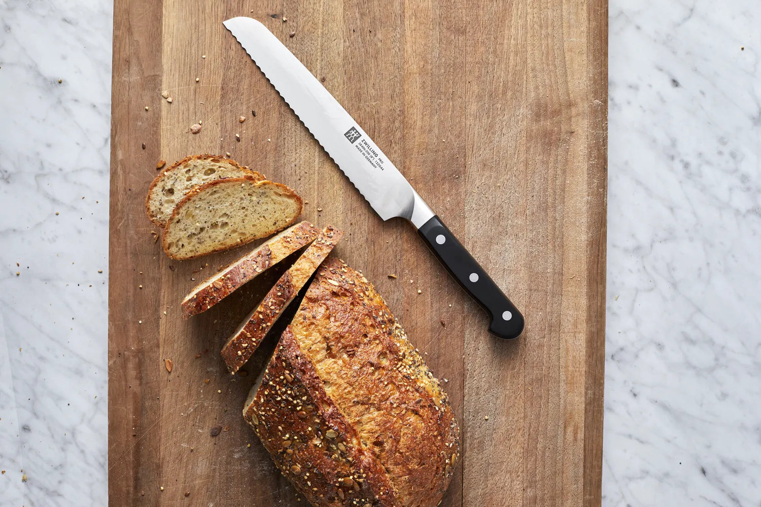 Denna högkvalitativa brödkniv från ZWILLING Pro-serien imponerar med sin unika form som möjliggör säker, exakt skärning och elegant design av den kända italienska designern Matteo Thun. Den 20 cm brödkniven har ett långt blad med en skarp räfflad kant som skivar genom hårda brödskorpor utan problem som gör att du kan skära snygga, enhetliga brödskivor. Den avfasade kanten som sträcker sig till bultarna gör att du enkelt kan klippa stora bröd. Knivens kilform, en symbios av japansk och europeisk knivdesign, garanterar stabilitet vid skärning. Det långa FRIODUR®-bladet är tillverkat av högkvalitativt ZWILLING specialbehandlat rostfritt stål, som avslutas med speciell ishärdning. Kniven är precisionssmidd av ett enda stålstycke för perfekt balans, vilket underlättar skäregenskaperna. ABS-plasthandtagen ger ökad säkerhet vid skärning. Tre nitar på handtaget kompletterar den eleganta designen av kniven. Med denna praktiska ZWILLING-brödkniv kommer du att kunna förbereda välsmakande smörgåsar på nolltid och skära perfekta brödskivor till frukosten.